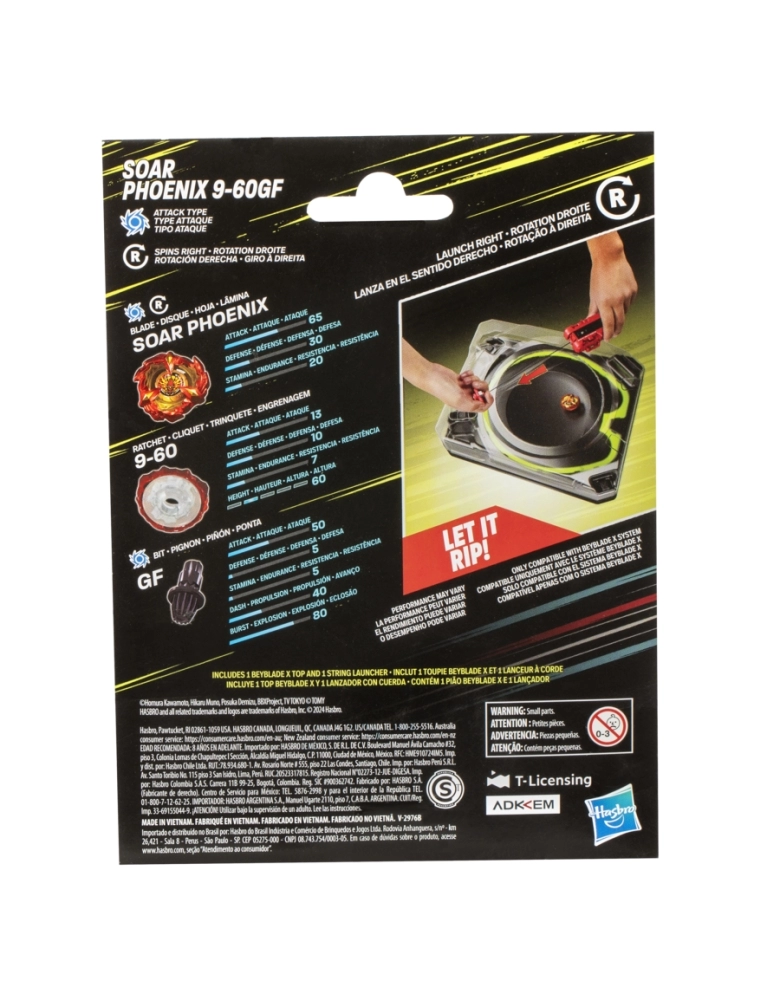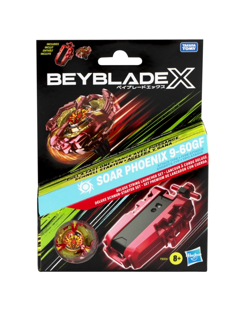 Toda a emoção da nova geração de piões Beyblade com o Kit premium de lançador com corda Beyblade X Soar Phoenix. O lançador com corda premium e pião Soar Phoenix 9-60GF tipo ataque de giro à direita é compatível com o sistema de engrenagem X-Celerator. Quando as engrenagens do pião Beyblade X encontram a guia da arena Beystadium (vendidas separadamente), os piões são lançados com um avanço Xtreme e alcançam velocidades surpreendentes que geram eclosões incríveis e impactos colossais. Basta puxar a corda do lançador para lançar o pião Soar Phoenix 9-60GF; Os fãs lançam os seus piões em batalhas selvagens contra os seus oponentes. O primeiro a marcar 4 pontos é o vencedor. Os fãs podem personalizar as camadas intercambiáveis da lâmina, engrenagem e ponta com outros piões Beyblade X (vendidos separadamente). Os brinquedos Hasbro Beyblade com metal fundido Takara Tomy autêntico são excelentes presentes para meninos e meninas a partir dos 8 anos. Hasbro and all related trademarks and logos are trademarks of Hasbro, Inc.