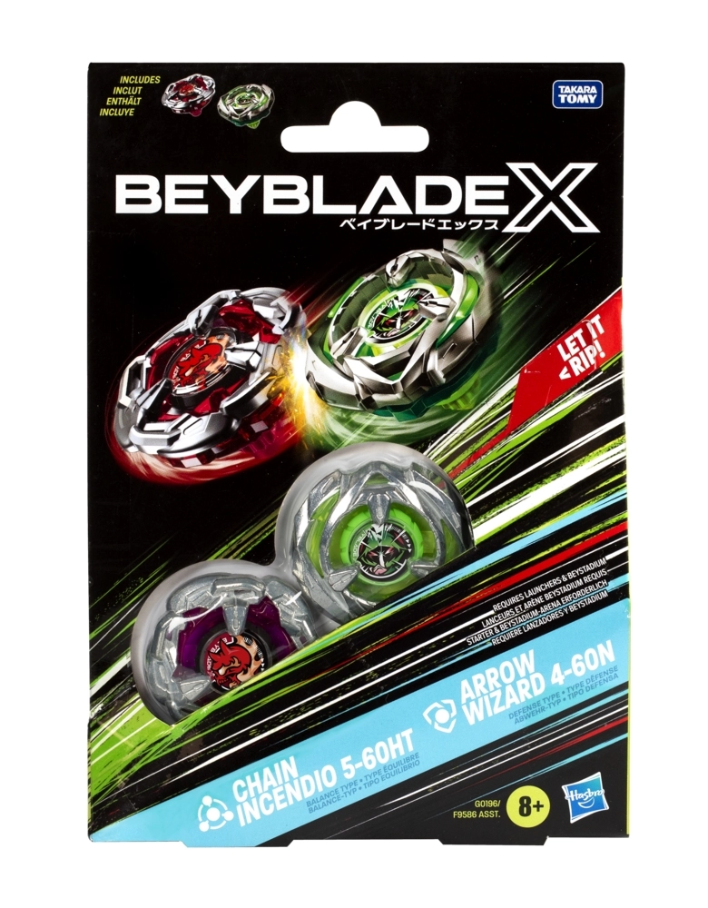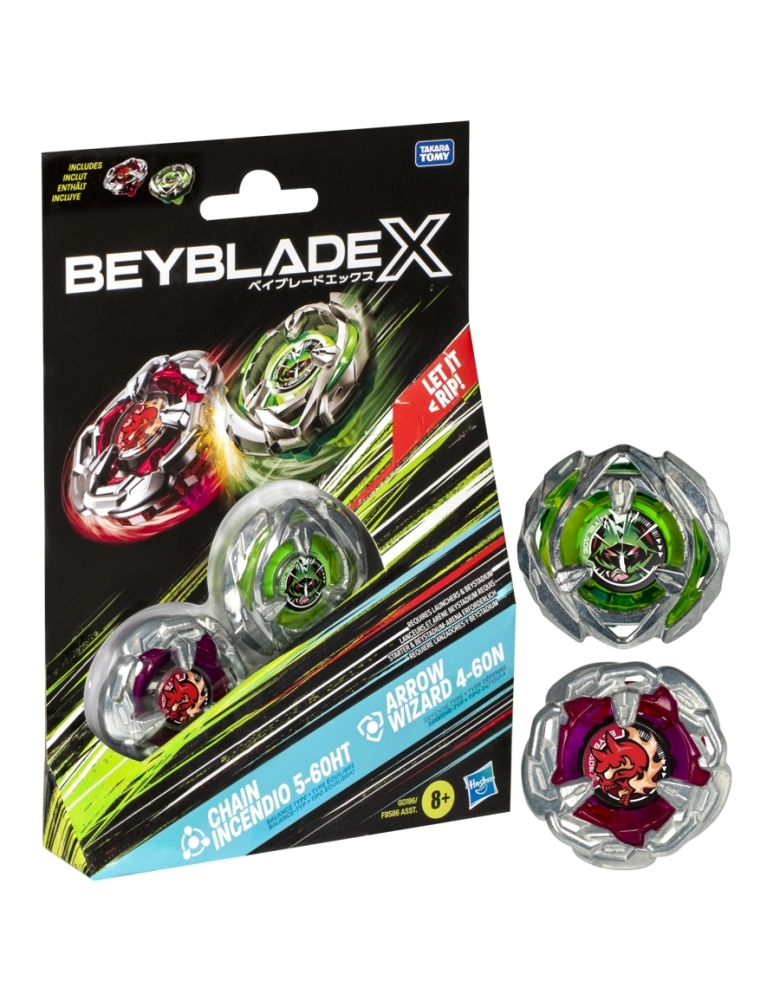 Toda a emoção da nova geração de arenas, lançadores e piões Beyblade: Este kit Beyblade X inclui 2 piões Chain Incêndio 5-60HT e Arrow Wizard 4-60N de giro à direita (requer lançador e arena Beystadium, vendidos separadamente). Entrar direto na batalha ou personalizar as camadas intercambiáveis da lâmina, engrenagem e ponta com outros piões Beyblade X (vendidos separadamente). O Beyblade X traz o sistema de engrenagem X-Celerator para elevar a batalha. Quando as engrenagens do pião Beyblade X encontram a guia da arena Beystadium, os piões são lançados com um avanço Xtreme e alcançam velocidades surpreendentes que geram eclosões incríveis e impactos colossais. Os fãs lançam os seus piões em batalhas selvagens contra os seus oponentes. O primeiro a marcar 4 pontos é o vencedor. Os brinquedos Hasbro Beyblade com metal fundido Takara Tomy autêntico são excelentes presentes para meninos e meninas a partir dos 8 anos. Hasbro and all related trademarks and logos are trademarks of Hasbro, Inc.