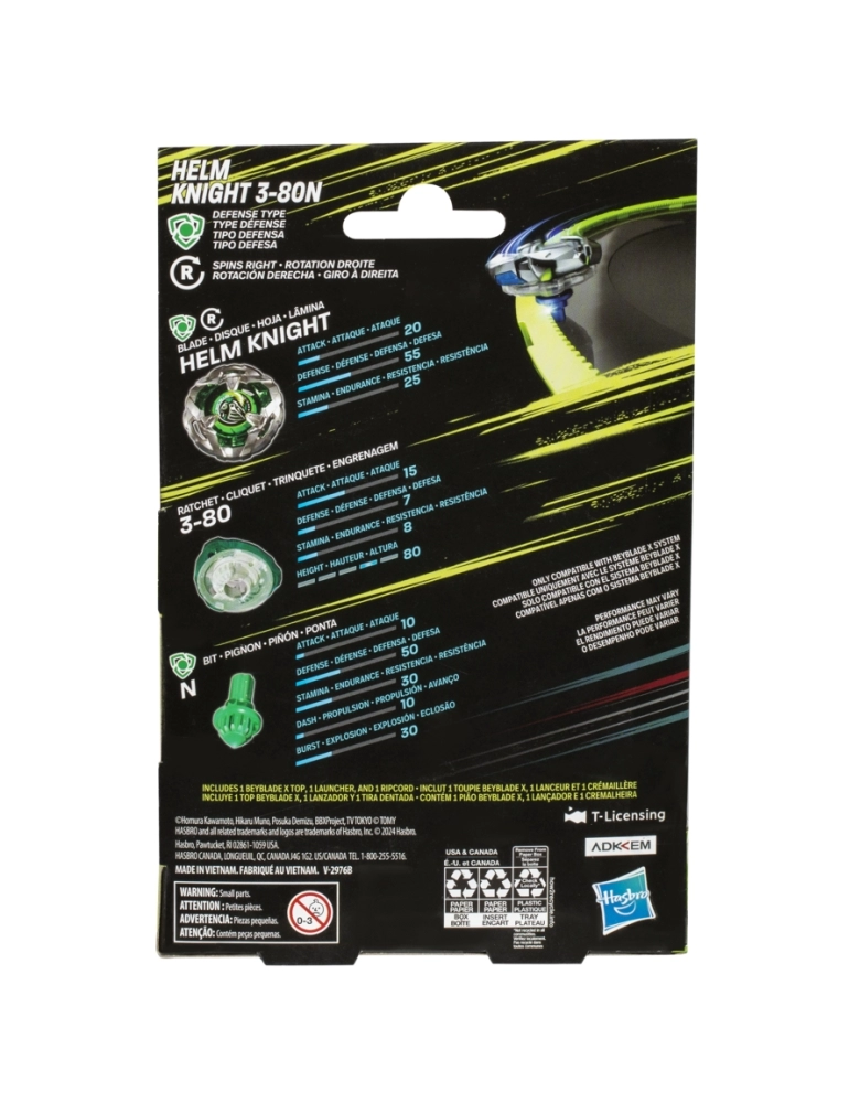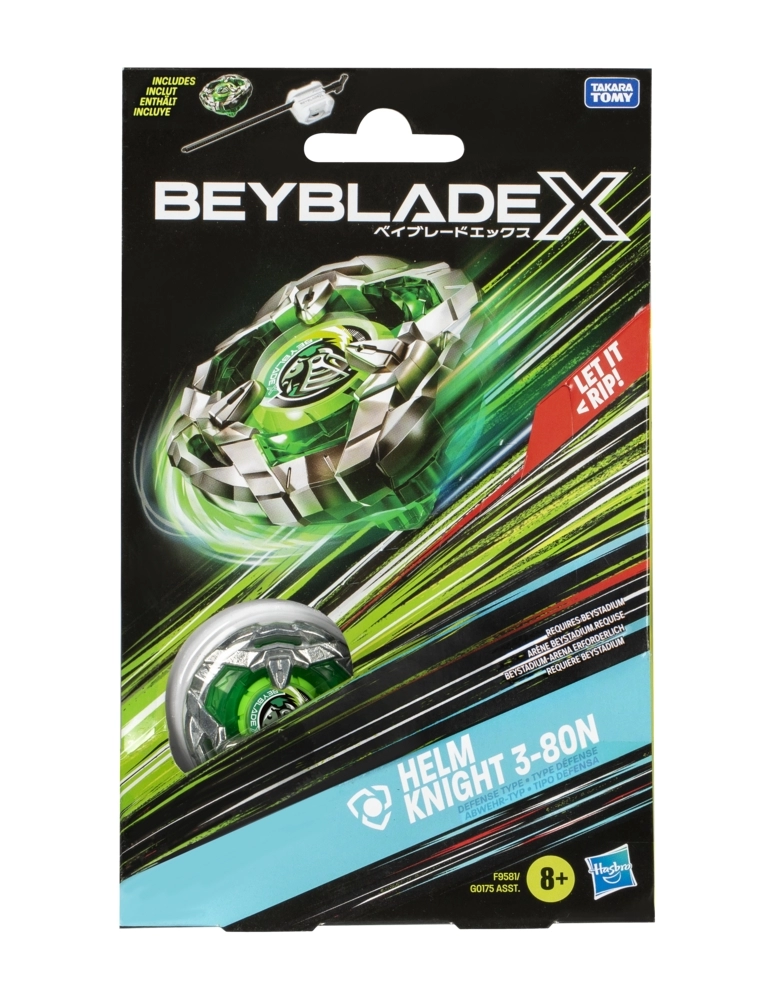 Toda a emoção da nova geração de arenas, lançadores e piões Beyblade: Este kit Inicial Beyblade X inclui 1 pião Helm Knight 3-80N tipo defesa e giro à direita e 1 lançador (requer Arena Beystadium required, vendida separadamente). Entrar direto na batalha ou personalizar as camadas intercambiáveis da lâmina, engrenagem e ponta com outros piões Beyblade X (vendidos separadamente). O Beyblade X traz o sistema de engrenagem X-Celerator para elevar a batalha. Quando as engrenagens do pião Beyblade X encontram a guia da arena Beystadium, os piões são lançados com um avanço Xtreme e alcançam velocidades surpreendentes que geram eclosões incríveis e impactos colossais. Os fãs lançam os seus piões em batalhas selvagens contra os seus oponentes. O primeiro a marcar 4 pontos é o vencedor. Os brinquedos Hasbro Beyblade com metal fundido Takara Tomy autêntico são excelentes presentes para meninos e meninas a partir dos 8 anos. Hasbro and all related trademarks and logos are trademarks of Hasbro, Inc.