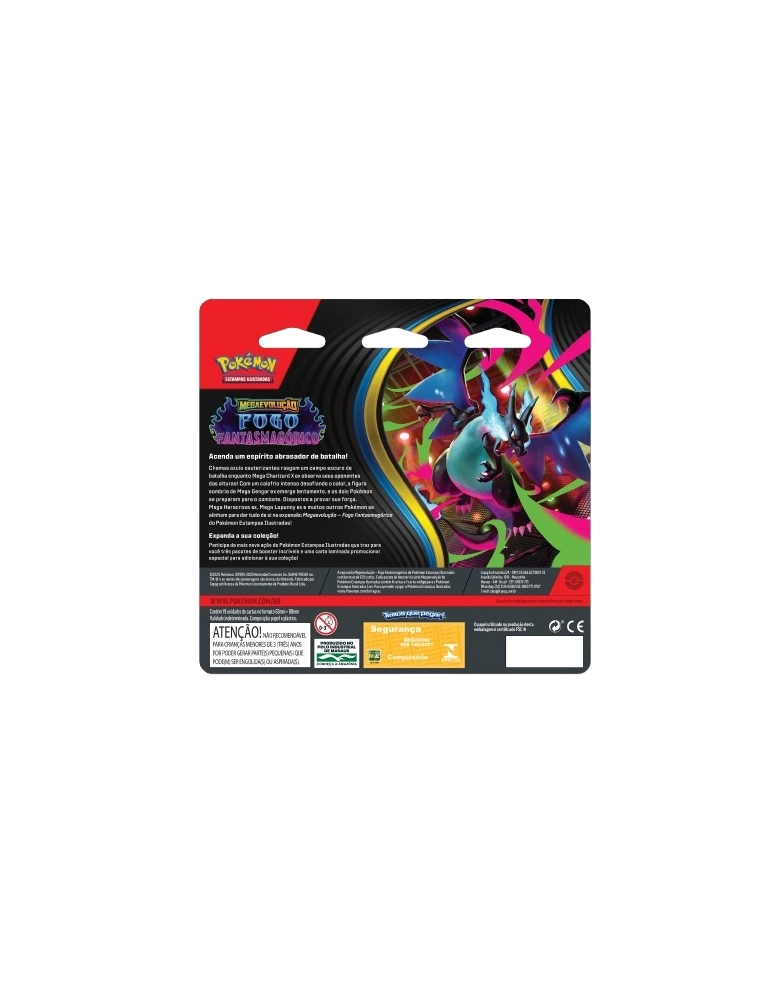 Acenda um espírito abrasador de batalha! Chamas azuis cauterizantes rasgam um campo escuro de batalha enquanto Mega Charizard X ex observa seus oponentes das alturas! Com um calafrio intenso desafiando o calor, a figura sombria de Mega Gengar ex emerge lentamente, e os dois Pokémon se preparam para o combate.