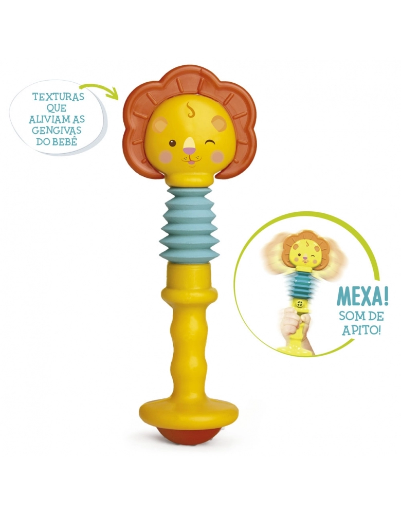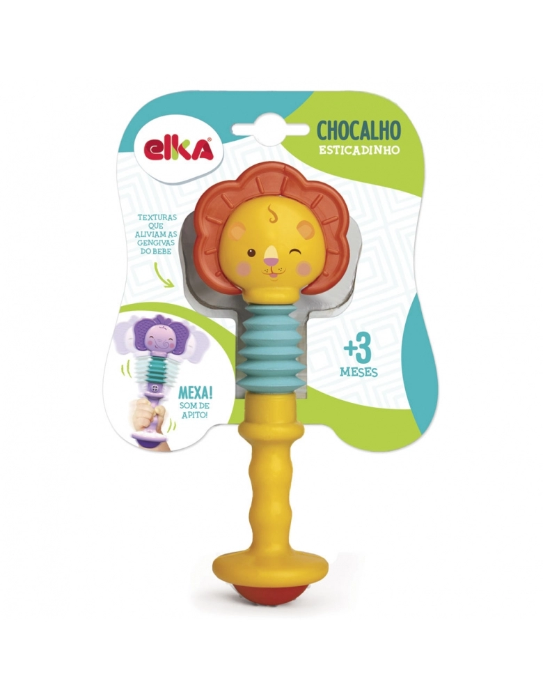 O Chocalho Esticadinho possui pega confortavel. é macio e gostoso de morder. balance e bata que ele faz som de apito. Produzido em material atóxico. sem ftalatos.