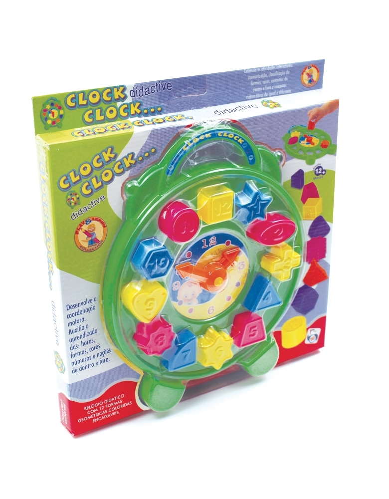 O relógio didático Clock Clock além de ensinar a criança a ver as horas, possui peças de encaixe com formas, desenvolvendo a coordenação motora, aprendizado de formas, cores, números e noção de dentro e fora.
