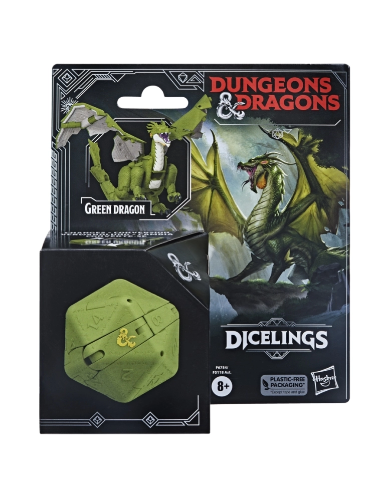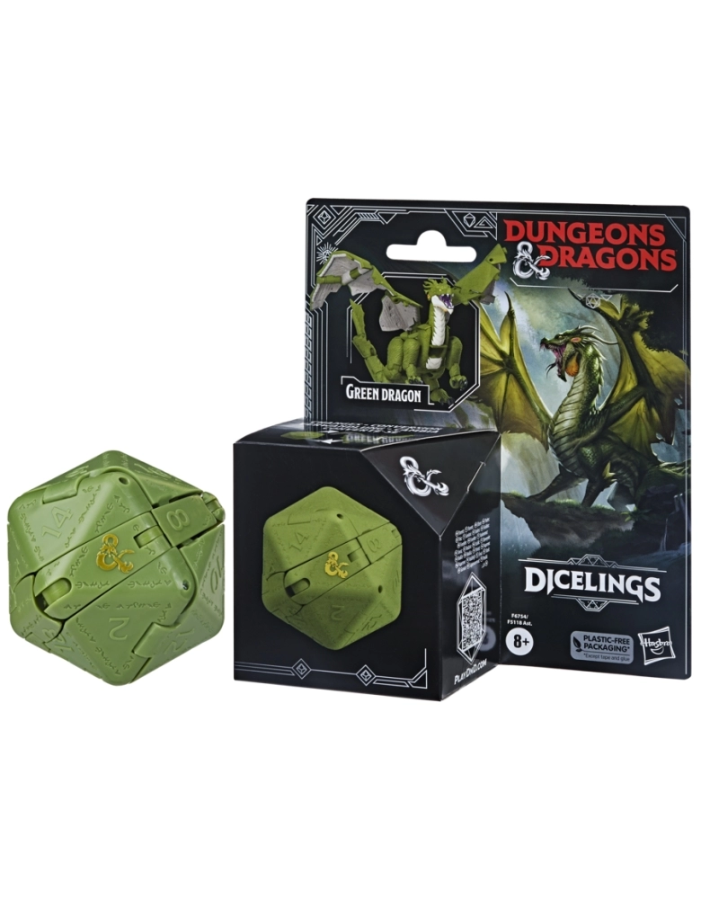 Laçar os dados para a aventura! O poderoso Dragão Verde é um dos muitos monstros que povoam os reinos de Dungeons & Dragons. Com Dicelings, agora os fãs podem ter uma figura D&D totalmente nova: uma que se pode transformar de um d20 gigante em um monstro e vice-versa! TM & ©2023 Wizards of the Coast LLC Hasbro e todos os termos relacionados são marcas comerciais da Hasbro.