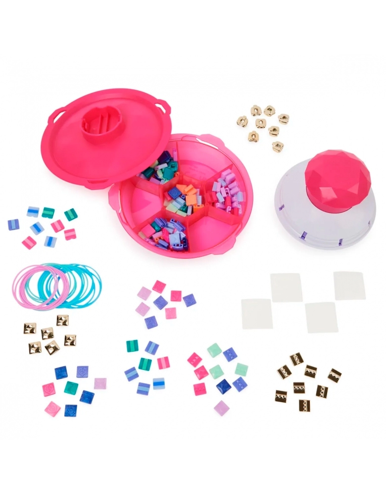 Inclui: 1 fábrica de pulseiras com armazenamento, 170 miçangas variadas, 22 elásticos de pulseira, 4 folhas de adesivos