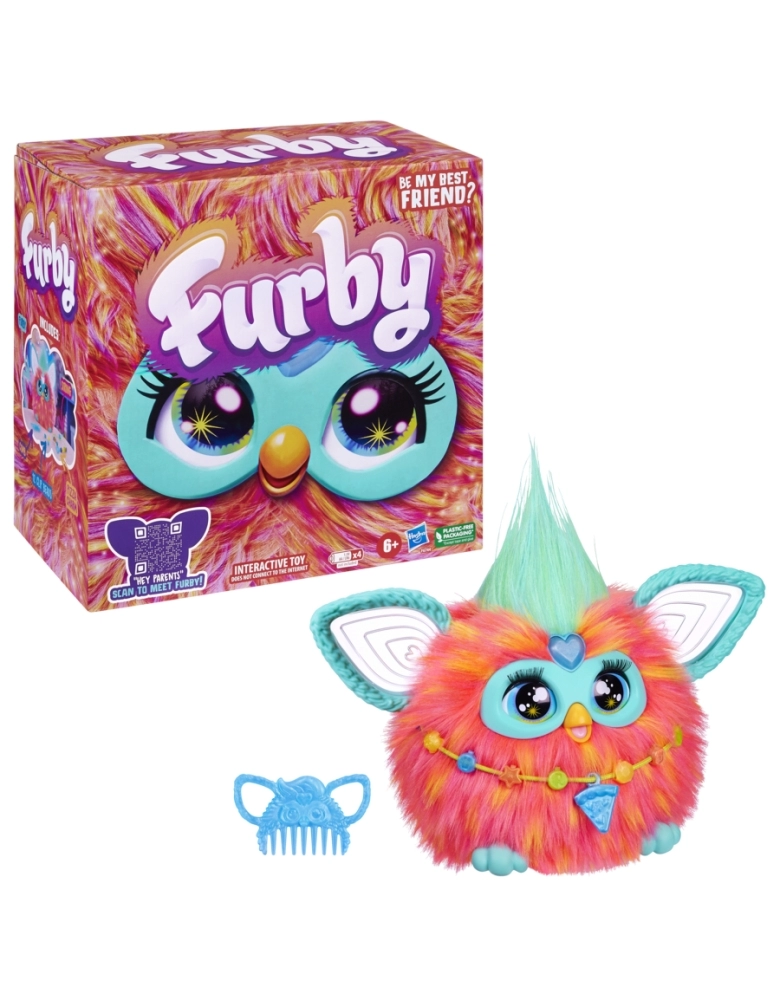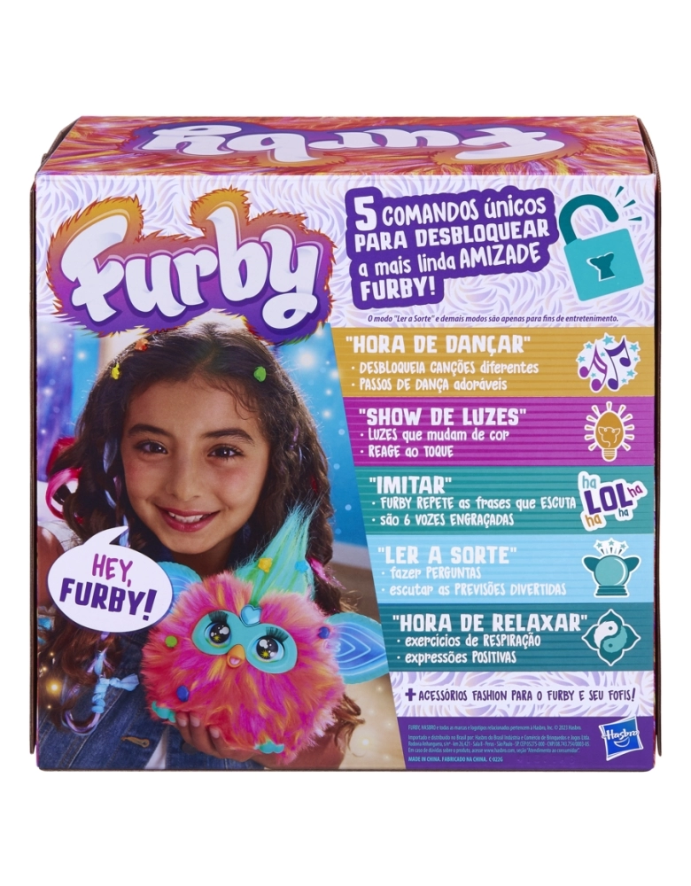 Conheça Furby! Este bichinho curioso é um brinquedo interativo incrível e um grande amigo com 5 modos ativados por voz e mais de 600 frases, piadas, músicas e muito mais. Muita diversão ao dizer ao Furby um destes 5 comandos: Hora de dançar, Imitar, Ler a sorte, Hora de relaxar e Show de luzes. Furby também responde a abraços, cafunés, sacudidas e ao ser alimentando com sua deliciosa pizza de plástico. Uau! Quanto mais um amigo interagir com Furby mais diversão ele irá desbloquear! Cuidar do Furby ao alimentar e pentear seu cabelo. Inclui acessórios que podem ser usados pelas as crianças e Furby. Este brinquedo de pelúcia eletrônico para meninas e meninos a partir dos 6 anos é um ótimo presente e um amigo muito divertido. Como diria Furby, "Dah-no-lah" (É hora da festa!). Furby e todas as propriedades relacionadas são marcas registradas da Hasbro.