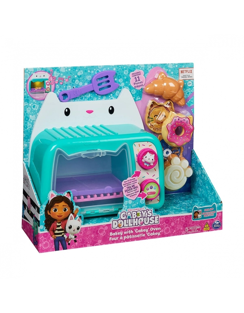 Com mais de 11 acessórios de cozinha para brincar, divirta-se cozinhando desde rosquinhas e croissants até deliciosas pizzas, rolinhos de canela e muito mais! O forninho do Cakey possui luzes e sons, basta pressionar o botão para acender as luzes e girar para ouvir sons, música, e frases com Cakey Cat (Pilhas Inclusas)! Para uma surpresa, escaneie o código QR, encontrado na embalagem do produto e desbloqueie uma recompensa especial no aplicativo gratuito Gabbys Dollhouse (disponível para iOS e Android).