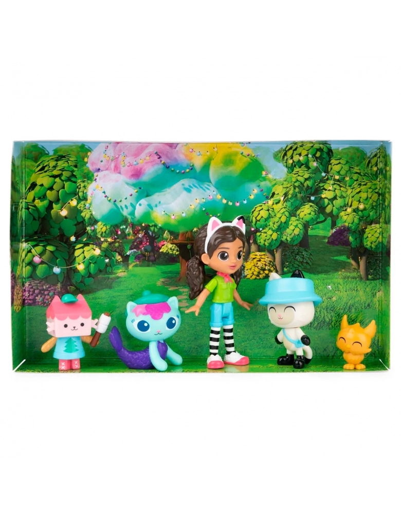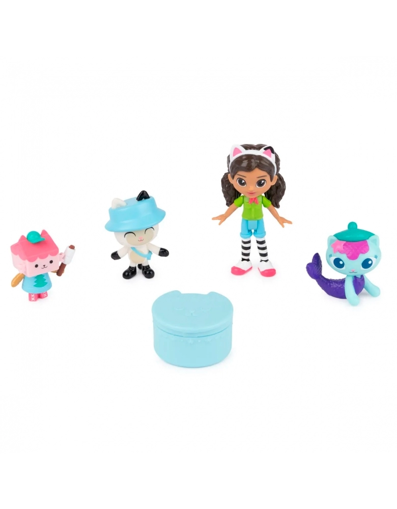 - O Pack De Figuras no Acampamento com Amigos vem com quatro bonecos colecionáveis, Gabby exclusiva com tema de acampamento, o Pandy, a MerCat, Baby Box Cat e uma Caixa de Entrega Surpresa, como as que aparecem na série!