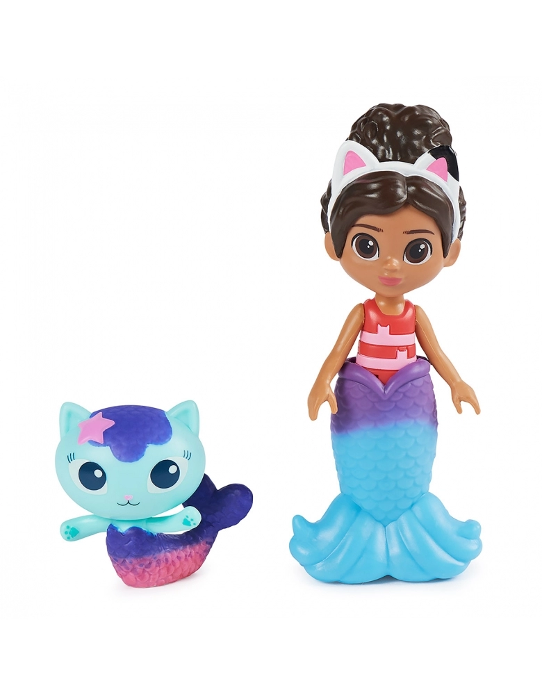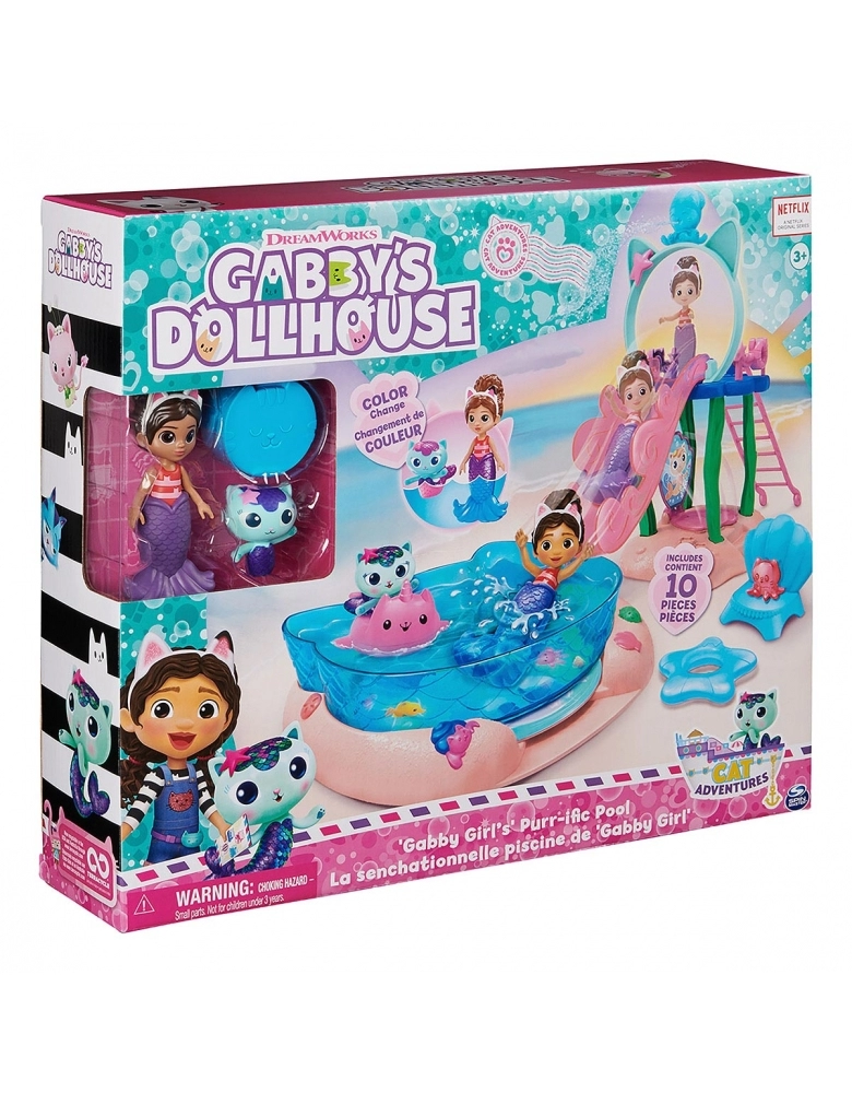 GABBY E MERCAT: Brinque com as figuras da Gabby e da MerCat, vestidas com suas roupas de banho super fofas que mudam de cor na água morna e com acessórios para a diversão à beira da piscina inclusos!