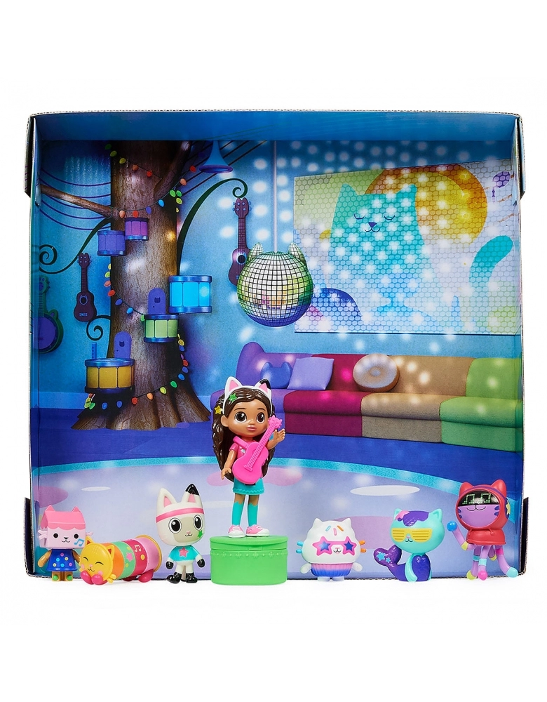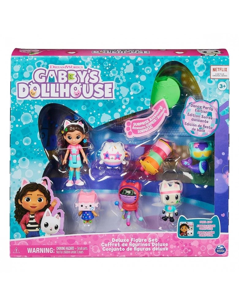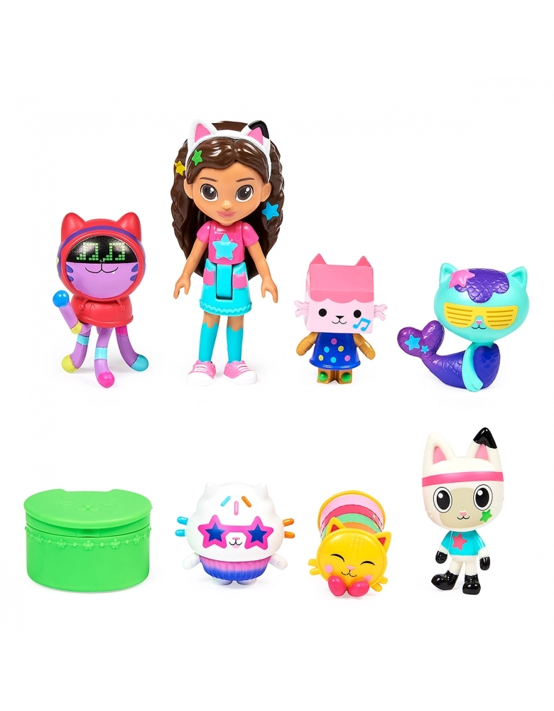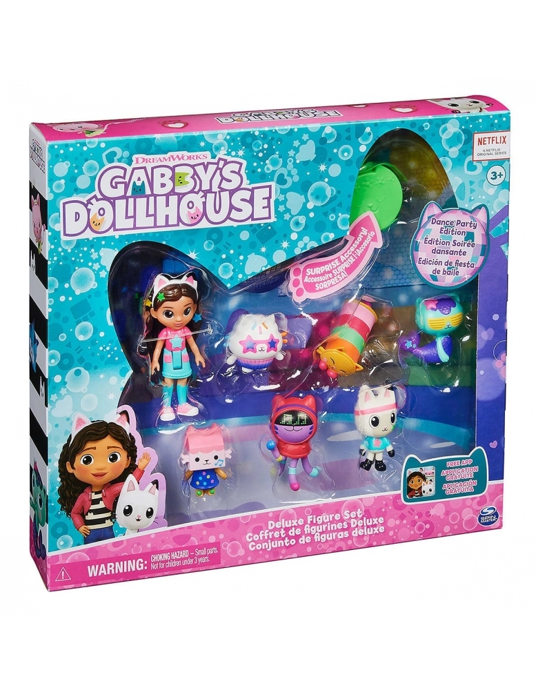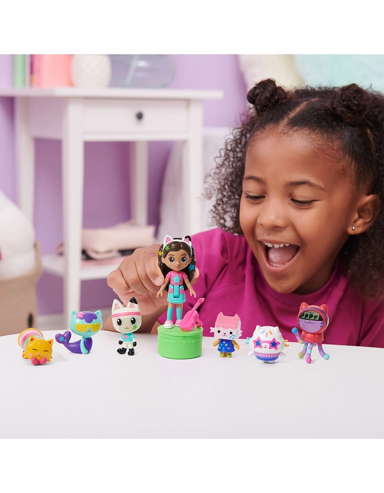 BONECAS DE GABBY'S DOLLHOUSE: Divirta-se com o Set De Figuras Deluxe Tema de Festa com 7 bonecas de Gabby' s Dollhouse inclusas! Boneca exclusiva da Gabby com tema de festa e os seus amigos gatinhos fantásticos, Baby Box Cat, Cakey Cat, DJ Catnip, Mercat, Pandy Paws e Pillow Cat!
