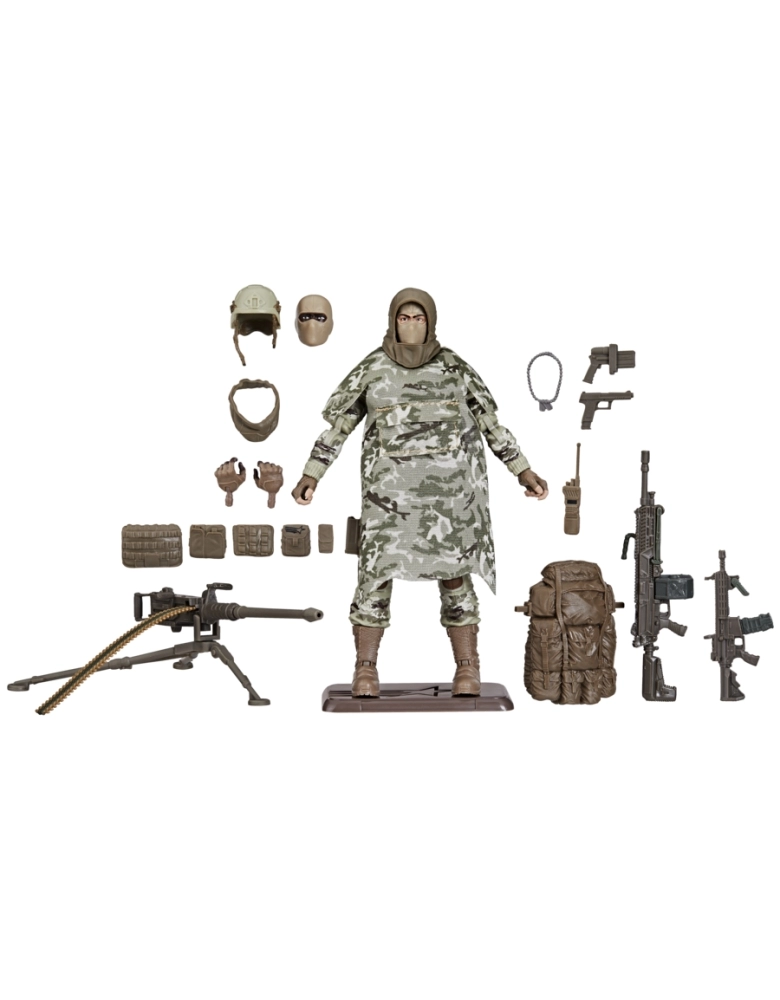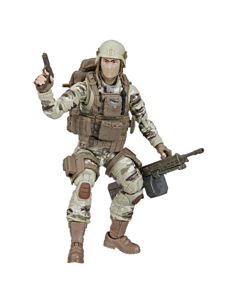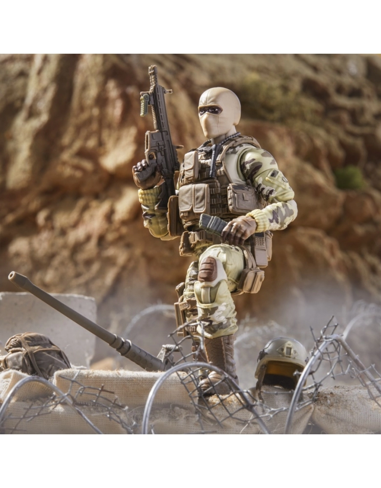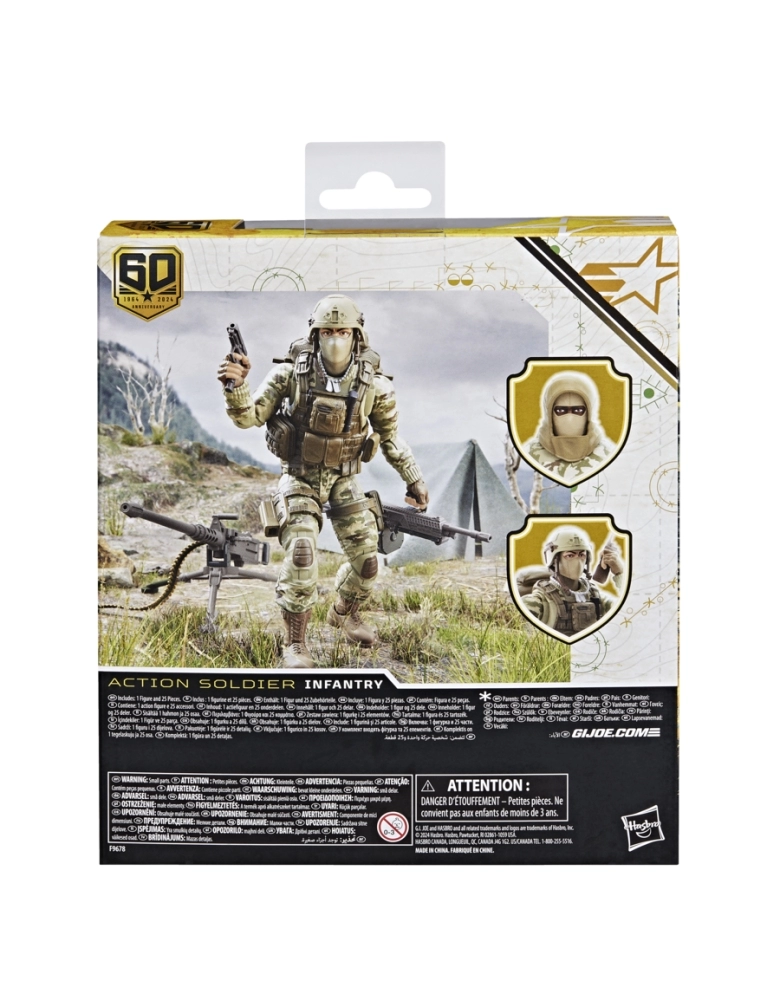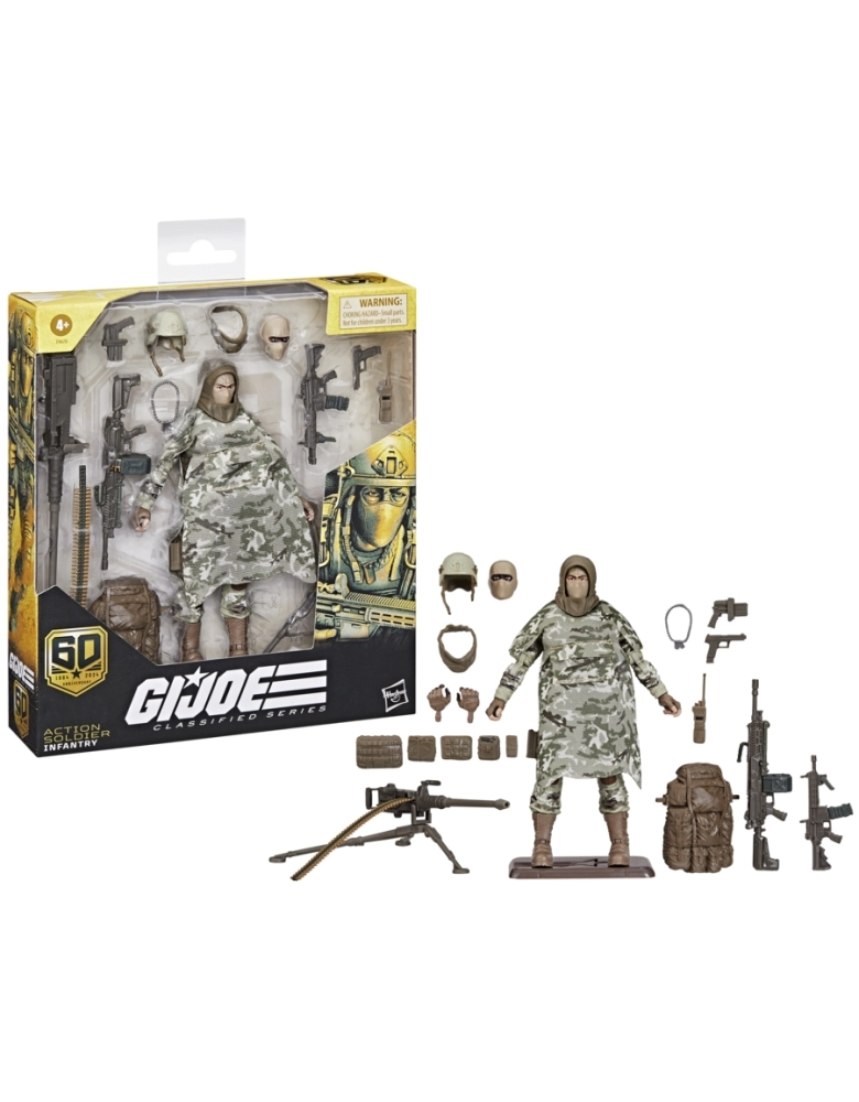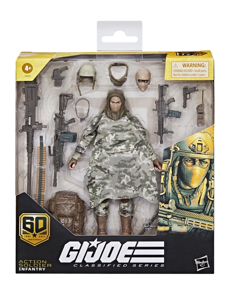 G.I. Joe estreou em 1964 com a figura original em homenagem aos membros do exército americano. O soldado, o marinheiro, o fuzileiro naval e o piloto de ação deixaram uma impressão indelével em gerações e lançaram uma franquia de brinquedos que continua a prosperar, encontrando novos fãs. Em comemoração ao seu 60º aniversário, a G.I. Joe está voltando ao seu passado histórico para trazer essas forças de combate móveis para a era moderna. Novidade na linha G.I. Joe Classified Series, o 60th Anniversary Action Soldier - Infantaria vem pronto para a aventura, com vários pontos de articulação para uma alta capacidade de posicionamento. Esta figura da Infantaria está repleta de 25 peças de acessórios inspirados no personagem, incluindo capacete, plaquetas de identificação, cabeça e mãos alternativas, mochila, poncho de tecido camuflado, walkie-talkie, cinto de munição, suporte para a figura, colete com 5 bolsas removíveis e vários acessórios de armas. O G.I. Joe Action Soldier está ao lado de seus companheiros da Infantaria, pronto para enfrentar as forças terrestres inimigas em todo o mundo. G.I. JOE and HASBRO and all related trademarks and logos are trademarks of Hasbro, Inc.