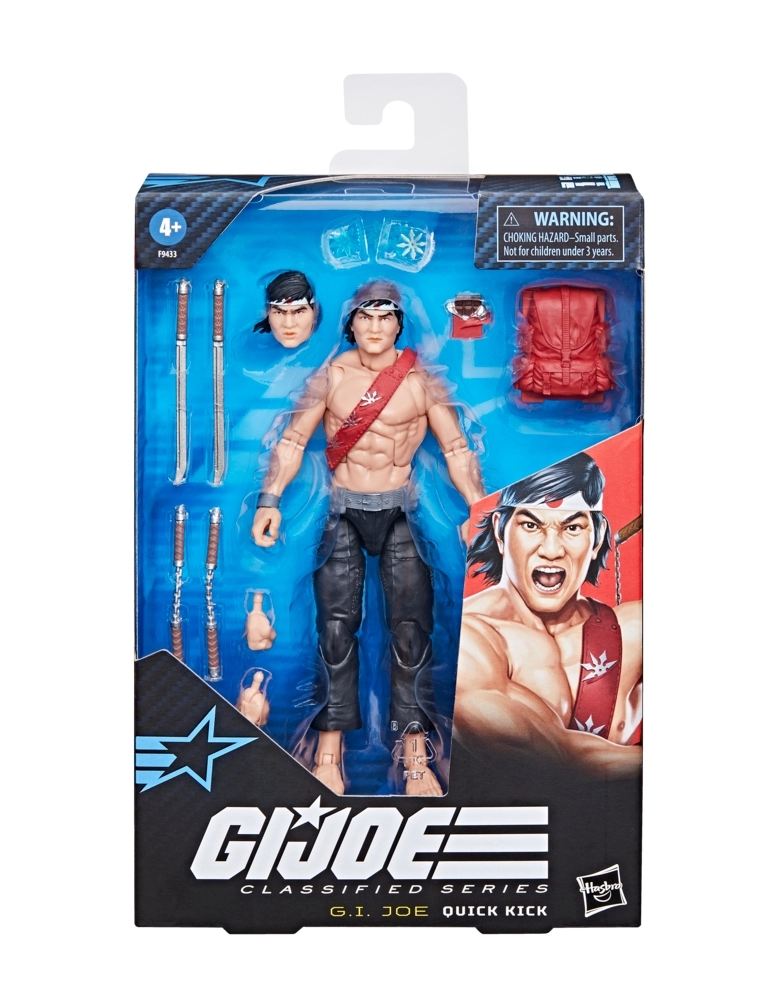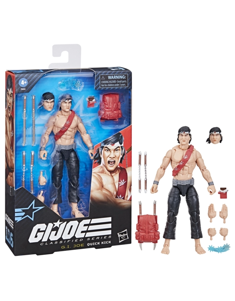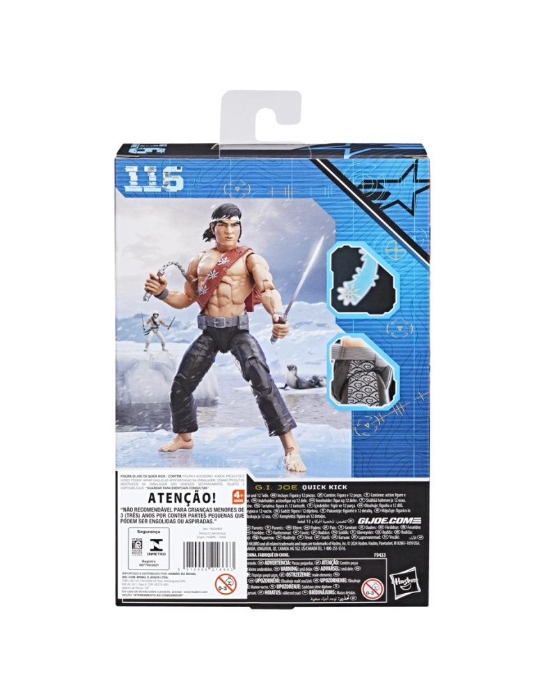 G.I. Joe é uma força de operações especiais altamente qualificada. Esses heróis extraordinariamente talentosos são selecionados por suas habilidades de elite e encarregados de defender o mundo contra a implacável organização criminosa Cobra, que se dedica à dominação mundial. Onde quer que haja problemas, G. I. Joe estará lá. Novidade nesta linha de figuras G.I. Joe Classified Series, o personagem vem pronto para a aventura, com vários pontos de articulação para várias poses. Essa figura do Quick Kick vem com 12 peças de acessórios inspirados no personagem, incluindo cabeça alternativa, punhos fechados alternativos e mãos com golpe de faca, mochila, 2 nunchuks, 2 espadas, um shuriken com efeito de arremesso e um Frozen Fudgie. Seu pai japonês e sua mãe coreana eram donos de uma mercearia em Watts. Muito baixo para jogar basquete quando era jovem, Quick Kick se voltou para as artes marciais. Ele é faixa preta em Tae Kwon Do, Goju-Ryu, Southern Praying Mantis Kung Fu, Tai Chi, Zen Sword e Wing Chun. Ele estava trabalhando como dublê em Hollywood quando foi recrutado para a equipe G.I. Joe. G.I. Joe and all related characters are trademarks of Hasbro.