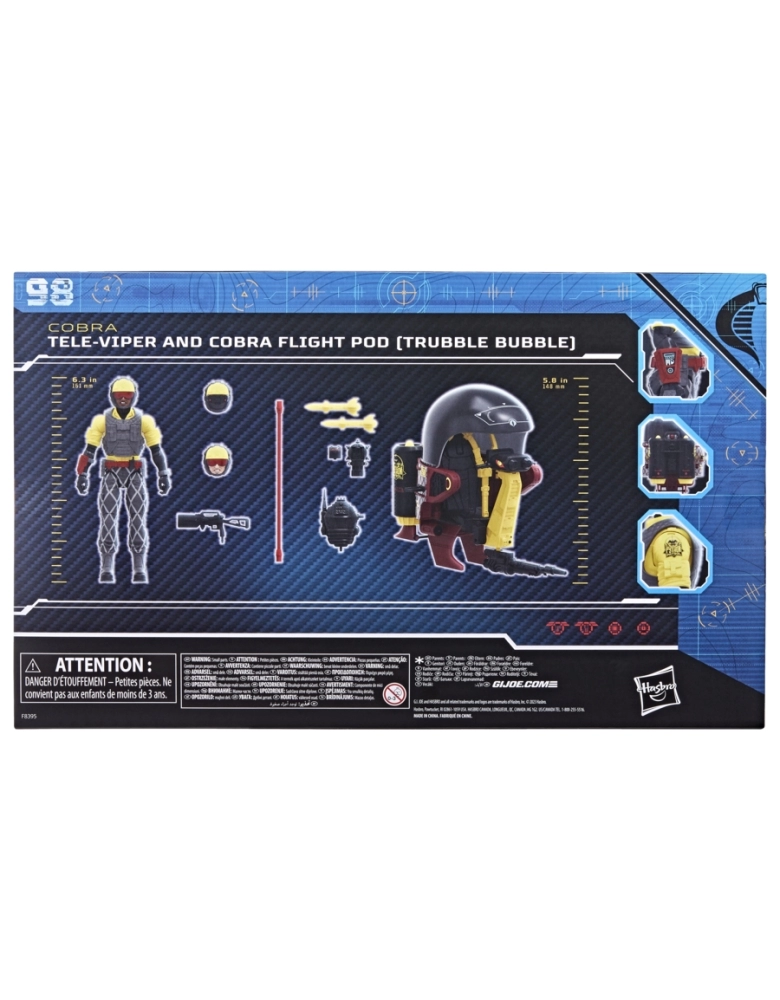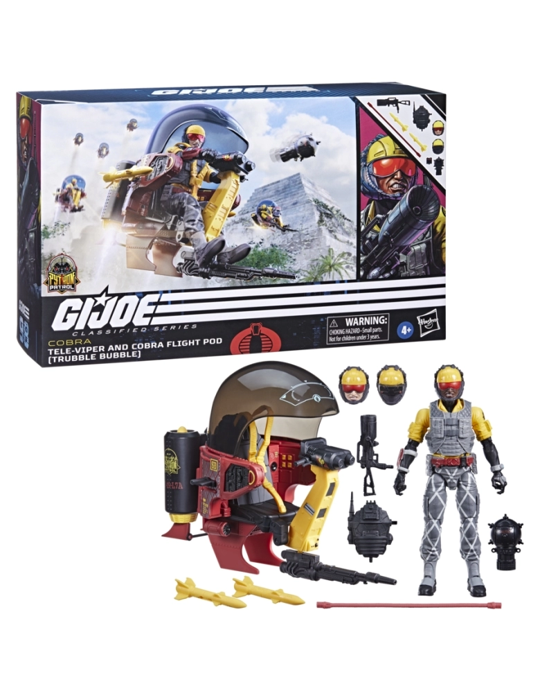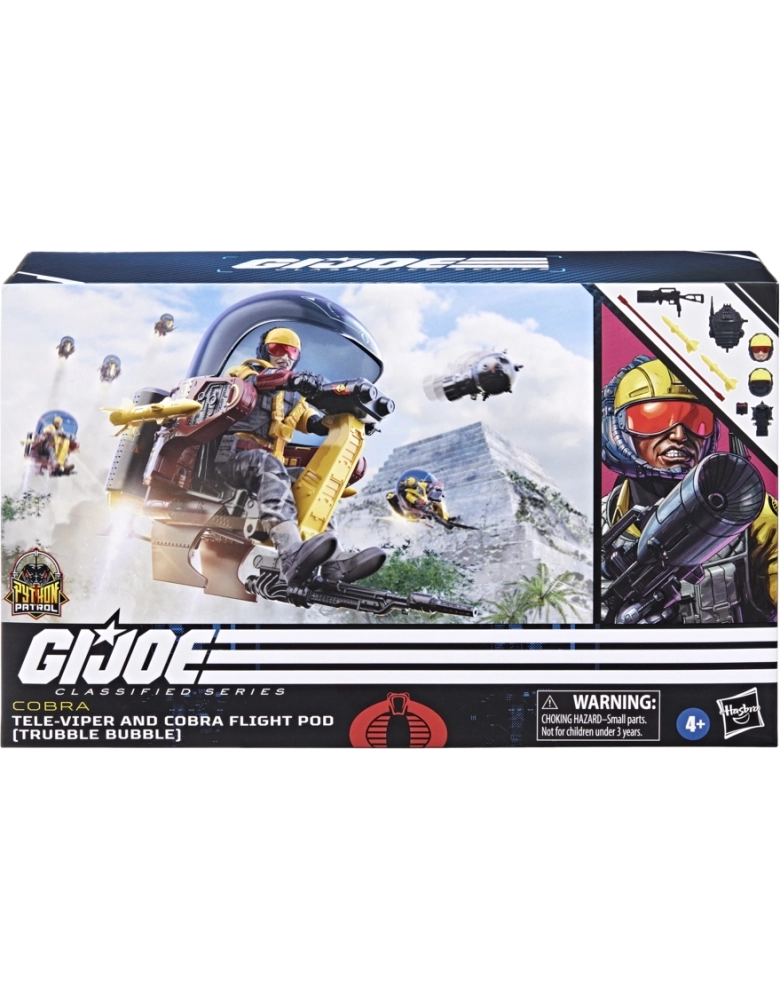 G.I. Joe é uma força de operações especiais altamente qualificada. Esses heróis extraordinariamente talentosos são selecionados por suas habilidades de elite e encarregados de defender o mundo contra a implacável organização criminosa Cobra, que se dedica à dominação mundial. Com coragem inabalável e determinação de aço, os corajosos membros de G.I. Joe estão preparados para perseguir e destruir os membros de Cobra em qualquer parte do planeta. De selvas hostis a montanhas árticas cobertas de gelo... onde quer que haja problemas, G. I. Joe estará lá. Nova figura na linha G.I. Joe em várias aventuras, com vários pontos de articulação para várias poses. Esse conjunto de figura e veículo Python Patrol Tele-Viper e Cobra Flight Pod (Trubble Bubble) vem 12 acessórios inspirados no personagem, incluindo duas cabeças alternativas, mochila com matriz de comunicação modular, uma mina aérea com escotilha removível e dois mísseis acessórios, além de um baú de cartolina para guardar o equipamento! Os Tele-Vipers entram em cena com seus jatos individuais enquanto bloqueiam as frequências de comunicação dos Joe. A confusão está armada! G.I. Joe and all related characters are trademarks of Hasbro.