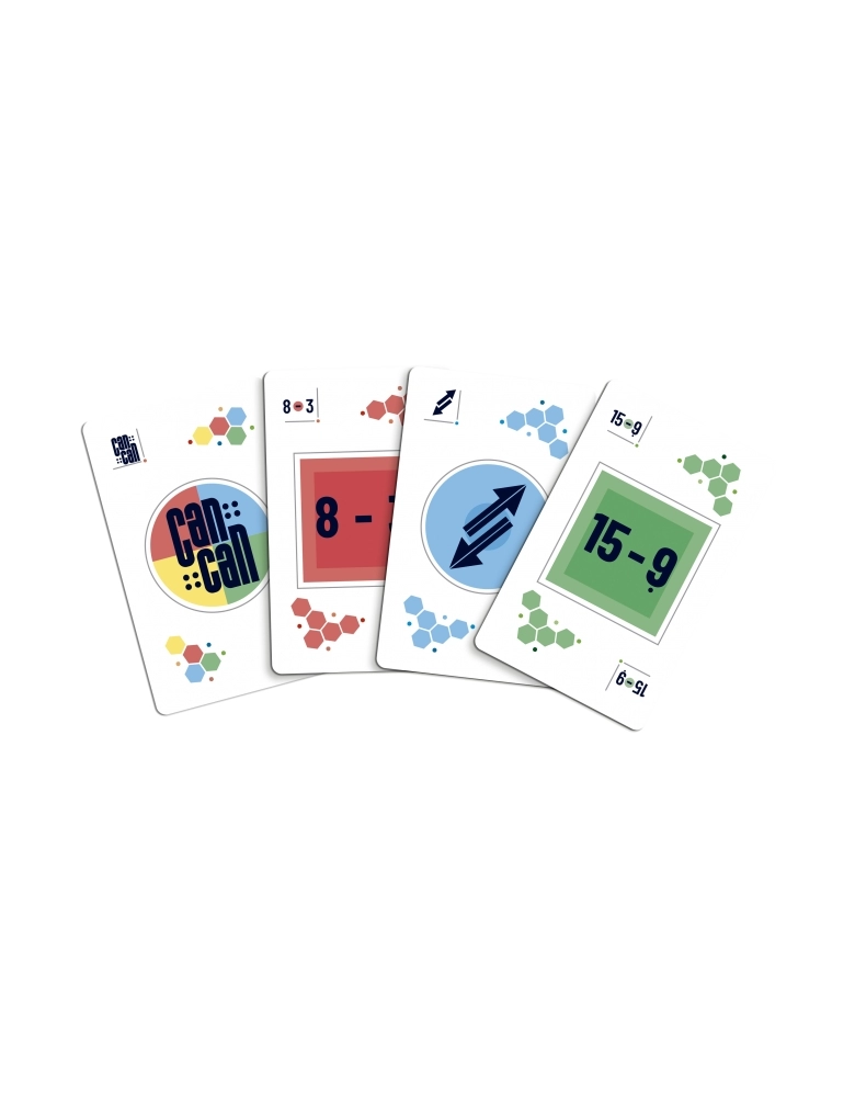 No jogo Can Can Matemático cada jogador recebe uma quantidade de cartas na sua mão que terão uma cor e uma operação, seja ela de soma ou subtração.