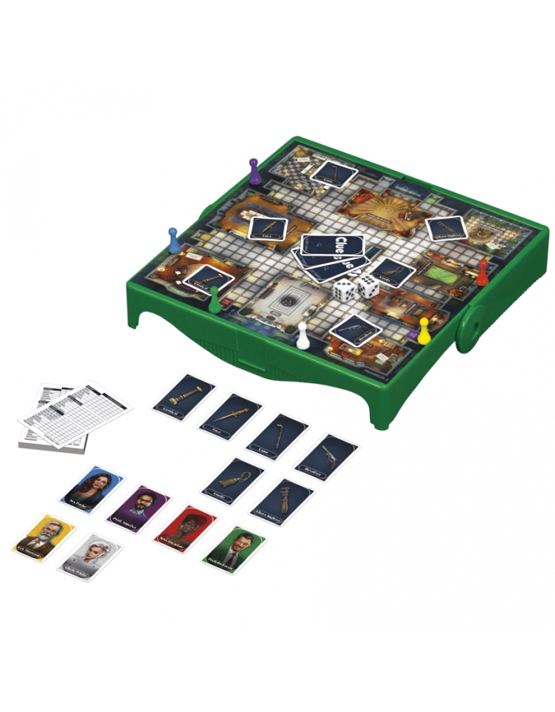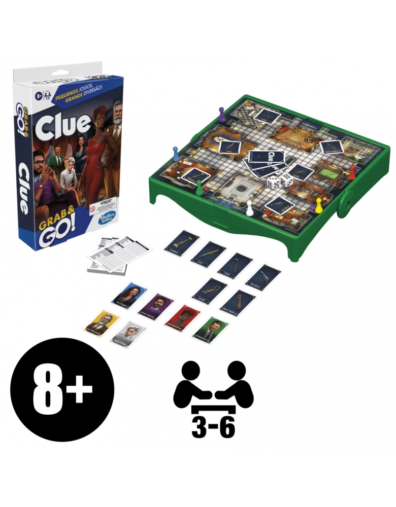 Há um mistério por resolver! O jogo Cluedo Grab & Go para 3 a 6 jogadores é uma excelente opção para passar o tempo em viagens de avião, comboio ou carro, bem como em acampamentos e nas férias. Quem assassinou o anfitrião? Onde e com que arma?