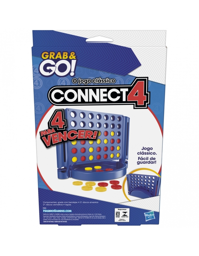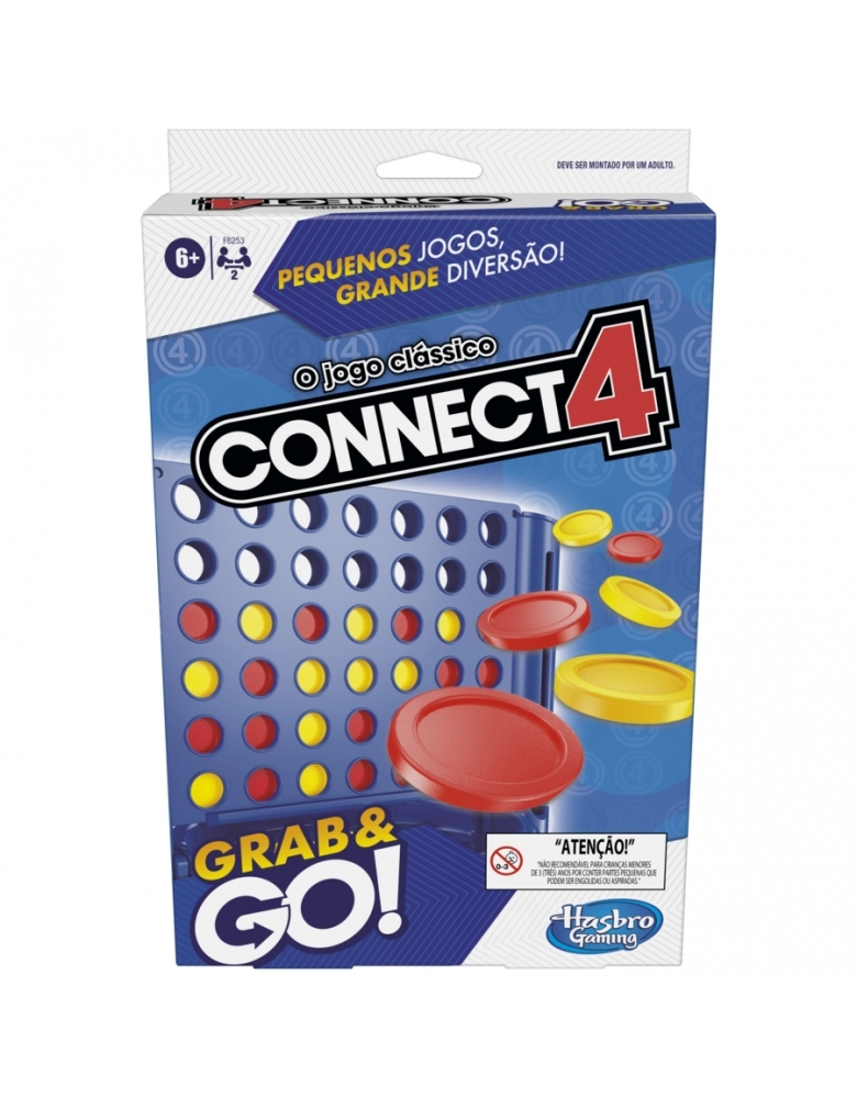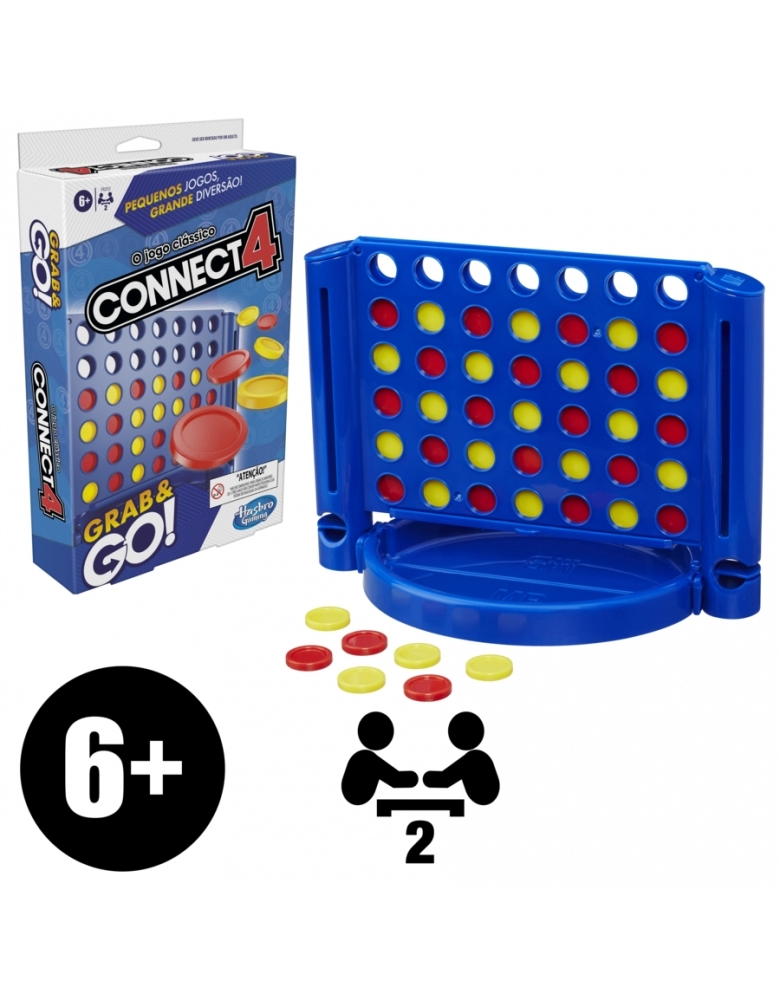 Alinhar 4 discos no jogo Connect 4 Grab and Go! Esta versão possui as mesmas regras do Connect 4 tradicional. Ambos os jogadores devem usar 21 fichas para tentar alinhar 4 discos. Cada jogador deve tentar bloquear o oponente com as suas próprias fichas. Depois da brincadeira, todas as peças podem ser guardadas na grade de jogo. Este jogo é um ótimo presente para crianças a partir dos 6 anos e adultos.