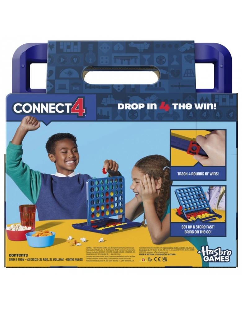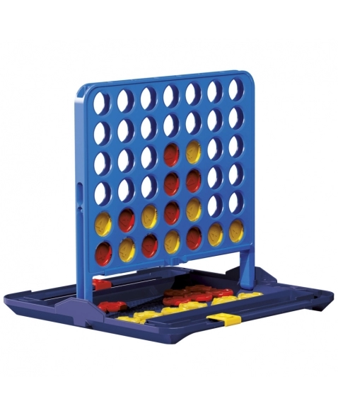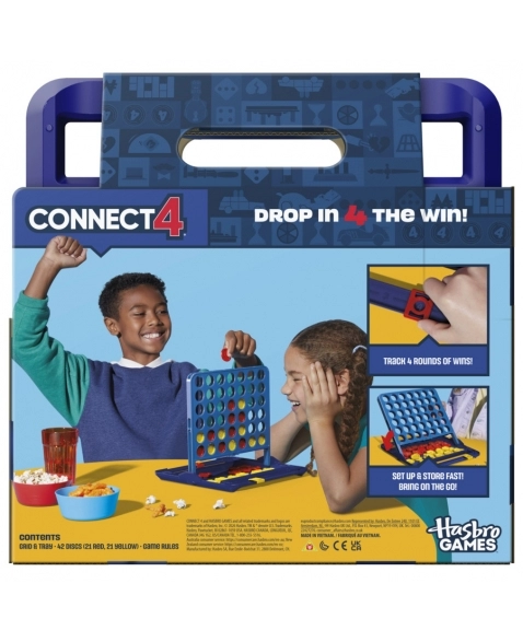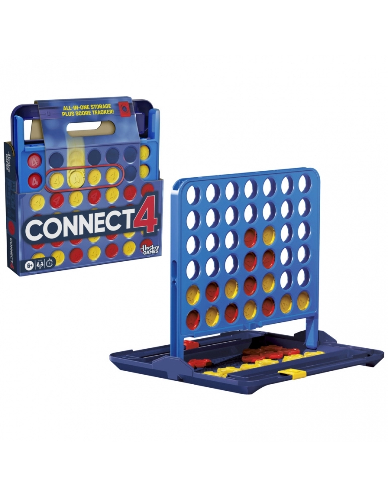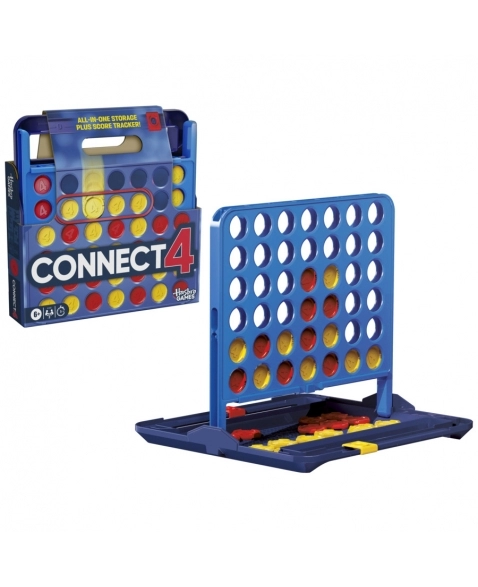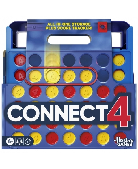 Alinhar 4 no jogo Connect 4! Esta edição do popular jogo para 2 jogadores combina a jogabilidade clássica com novos recursos, como um estojo de transporte multifuncional, armazenamento de discos e marcador de pontos. Para jogar, cada jogador coloca seus discos na grade e tenta obter 4 de seus discos coloridos em uma linha. Crie estratégias e bloqueie os adversários para afundar o disco vencedor. O primeiro a vencer 4 rodadas é o campeão, e agora os jogadores podem acompanhar as vitórias com rastreadores de pontuação integrados. Esta edição portátil foi projetada para facilitar o armazenamento e o jogo em qualquer lugar. Os discos são convenientemente armazenados dentro da unidade de jogo, que se converte em um estojo de transporte com alça! O jogo Connect 4 é muito divertido para festas de aniversário de crianças, encontros com amigos, reuniões de família, quebra-gelos e dormitórios.