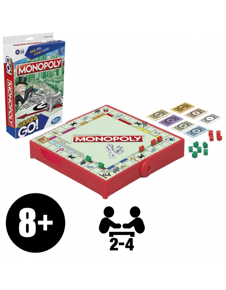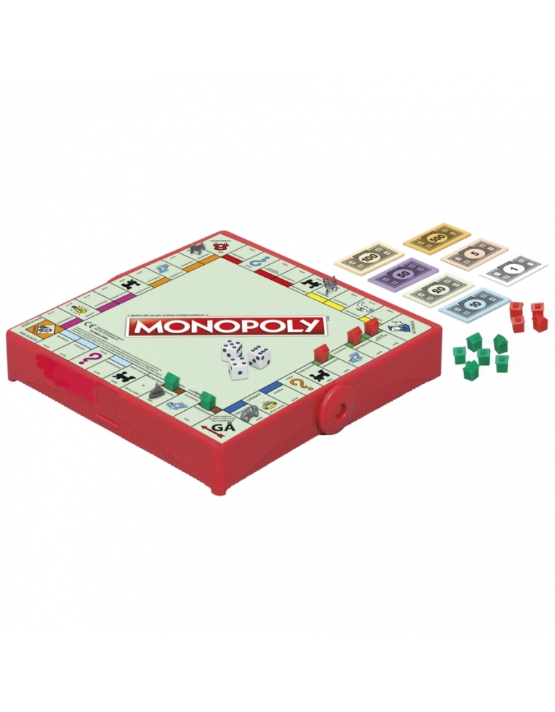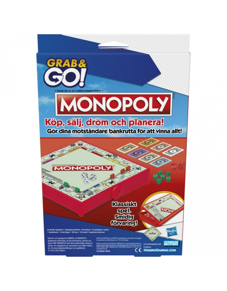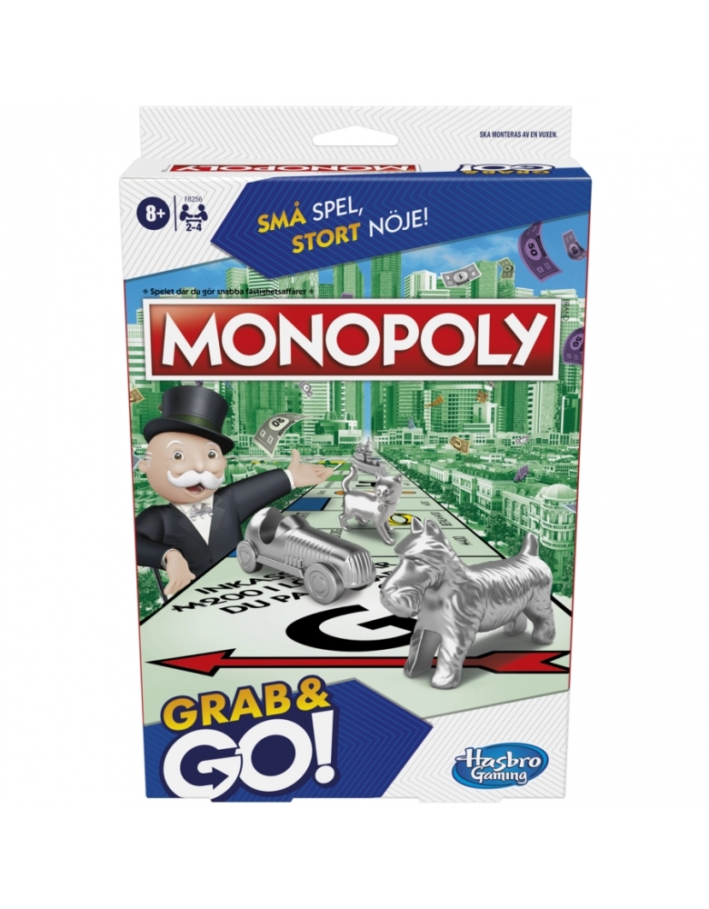Plim, plim! O jogo Monopoly Grab and Go é uma versão compacta do jogo Monopoly que traz as mesas regras do jogo original em um formato de bolso. Como no Monopoly original, os jogadores compram, vendem e sonham para ficarem ricos e vencerem a partida. As cartas Sorte e Cofre podem mudar o jogo. Elas vão enriquecer um jogador ou mandá-lo para a prisão? Este jogo portátil para 2 ou 4 jogadores é um ótimo presente para adultos e crianças a partir dos 8 anos. Com o formato de bolso, este jogo pode ser levado a qualquer lugar.