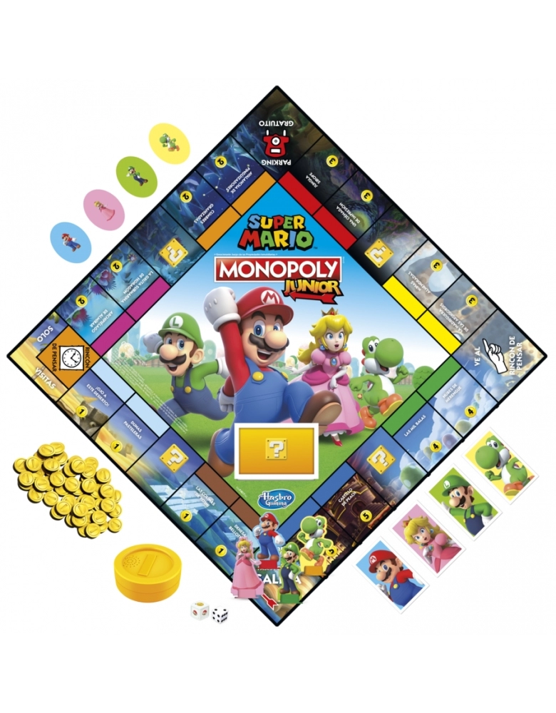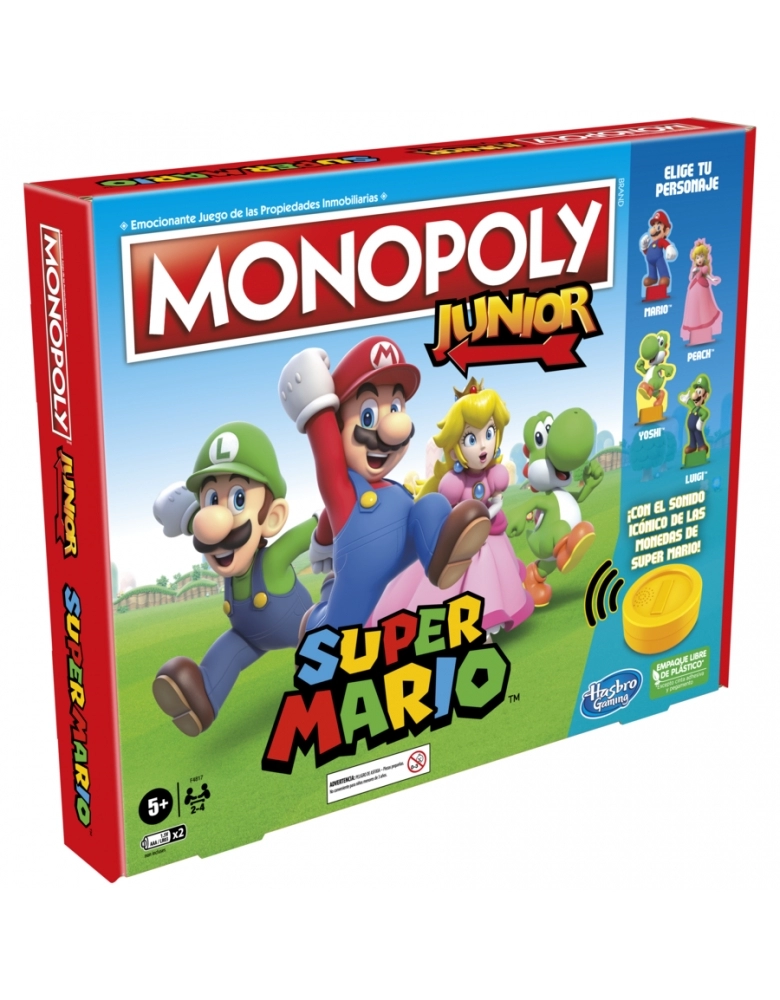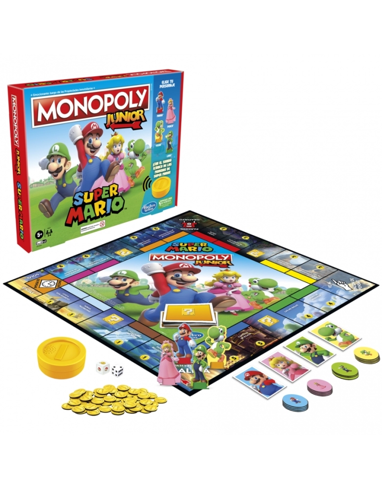 Neste jogo Monopoly Junior, as crianças podem imaginar uma aventura mágica no mundo do Super Mario. Os jogadores movimentam-se pelo tabuleiro com os seus personagens favoritos Mario, Luigi, Princesa Peach ou Yoshi comprando propriedades e coletando moedas. Os jogadores devem lançar o dado especial para saber se podem apertar a Moeda sonora para receber moedas ao escutar o clássico efeito sonoro do Super Mario. O jogo Monopoly Junior para crianças a partir de 5 anos é feito para ser rápido e servir como uma introdução ao mundo Monopoly. Trademark and Copyright 2021 Nintendo. All Rights Reserved. Os nomes e logotipos Hasbro, Hasbro Gaming, Parker Brothers e Monopoly, o desenho do tabuleiro, os quatro cantos quadrados, o nome e personagem Mr. Monopoly e cada um dos elementos do tabuleiro e peças do jogo são marcas comerciais da Hasbro para o respetivo jogo de compra e venda de propriedades e equipamento de jogo.