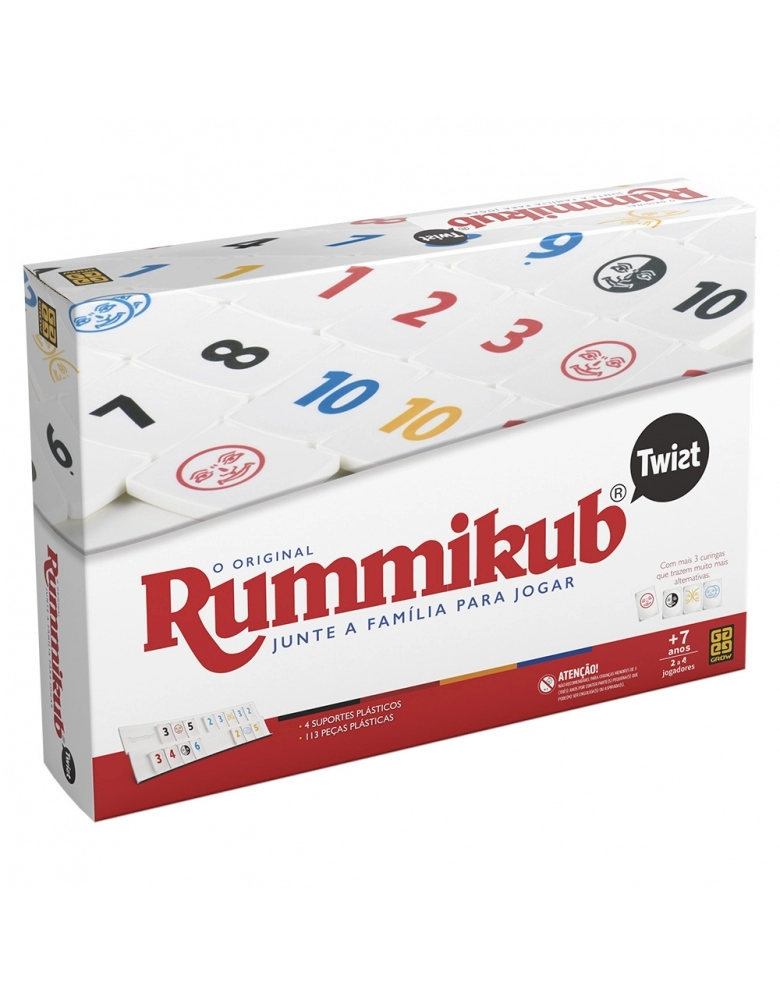 O jogo favorito da família com um novo toque surpreendente! Rummikub já vendeu mais de 50 milhões de cópias no mundo e agora ganha uma versão nova. Jogado exatamente da mesma maneira que no jogo clássico, o Rummikub Twist inclui três novos tipos de Coringa! O coringa- espelho, o Coringa Muda-Cor e o Coringa Duplo, que se juntam ao Coringa padrão. Essa versão também apresenta um novo visual e suporte panorâmico curvo, novo design e forma das peças e uma bela caixa colorida