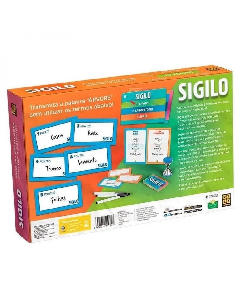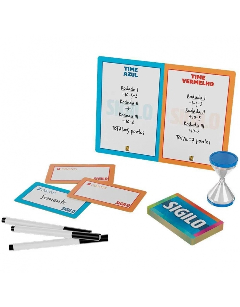 Ser rápido e criativo é fundamental para ter sucesso neste jogo! Sigilo proporciona uma disputa dinâmica e divertida: as equipes têm uma palavra-alvo a cada rodada para adivinhar em 1 minuto. O grande detalhe é que o jogador responsável por dar as dicas não pode falar nenhuma das 5 palavras que a equipe adversária tiver escolhido. Ou seja, as equipes devem dificultar ao máximo a vida dos adversários, para que eles falem dicas óbvias e percam pontos que variam de 1 a 5. Agora, se você for craque no vocabulário, poderá fazer com que sua equipe adivinhe a palavra-alvo e ganhe 10 pontos na rodada. É óbvio que você vai querer sua equipe vença, não?