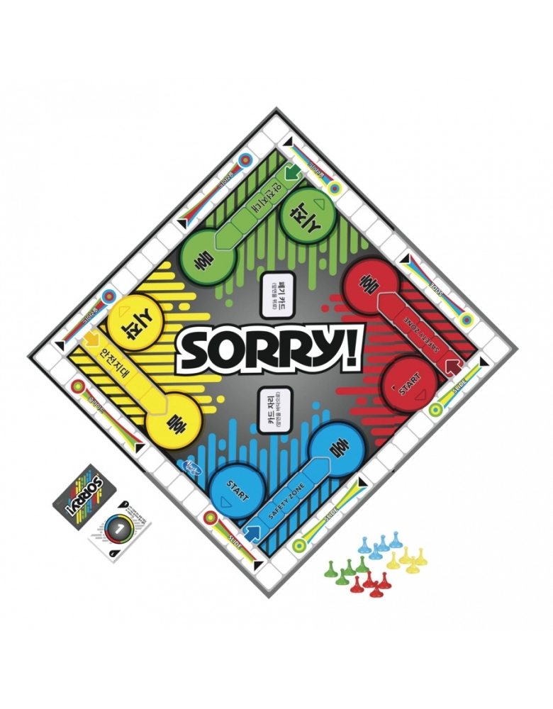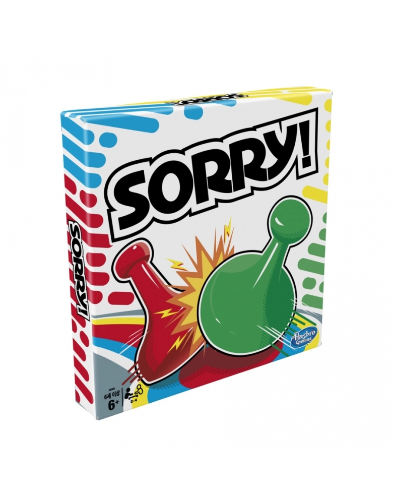 Em Sorry!, os jogadores retiram cartas para ver quantos espaços podem mover suas peças. Se a peça parar em um escorregador, eles podem pegar um atalho até o final e retirar as peças dos adversários de jogo... ou as suas próprias peças! É possível ainda pular peças e se esconder na Área Segura, onde os adversários não podem entrar. As crianças devem levar todas as suas três peças do Início até a Base. Mas cuidado: os outros jogadores podem fazer as peças voltarem ao início do jogo! Sorry! e todos os personagens relacionados são marcas registradas da Hasbro.
