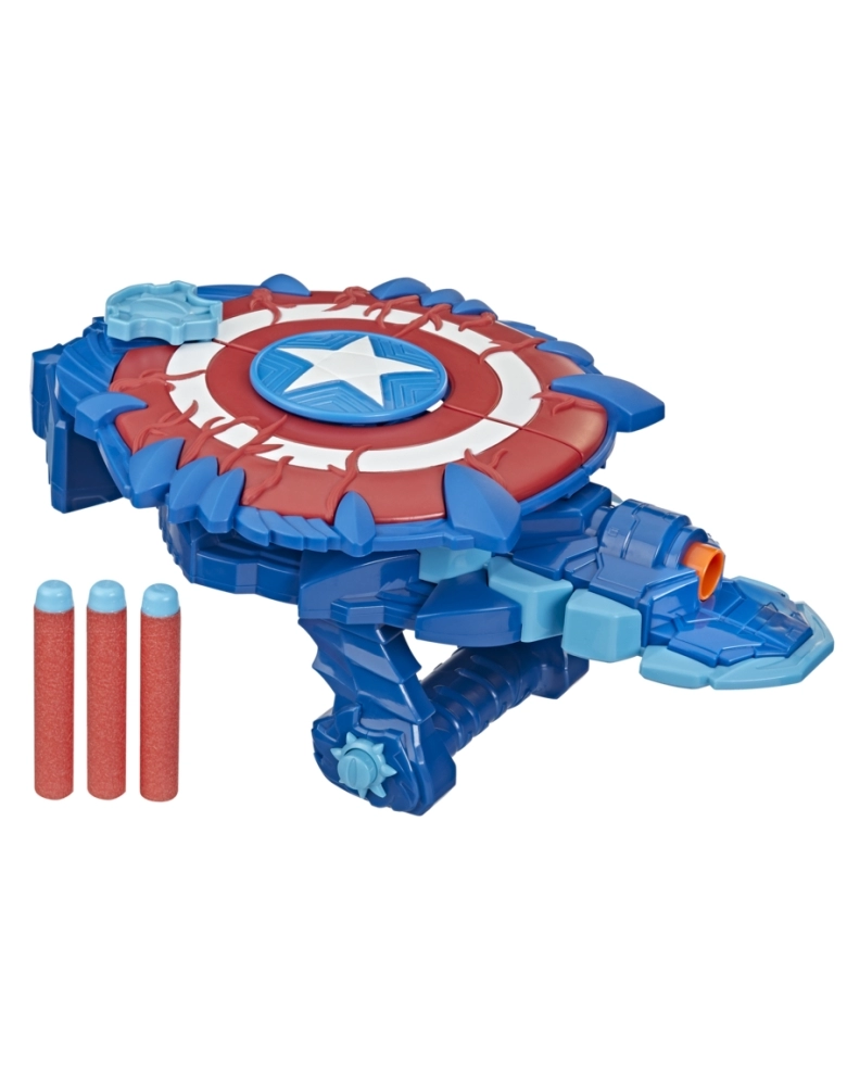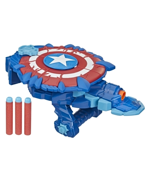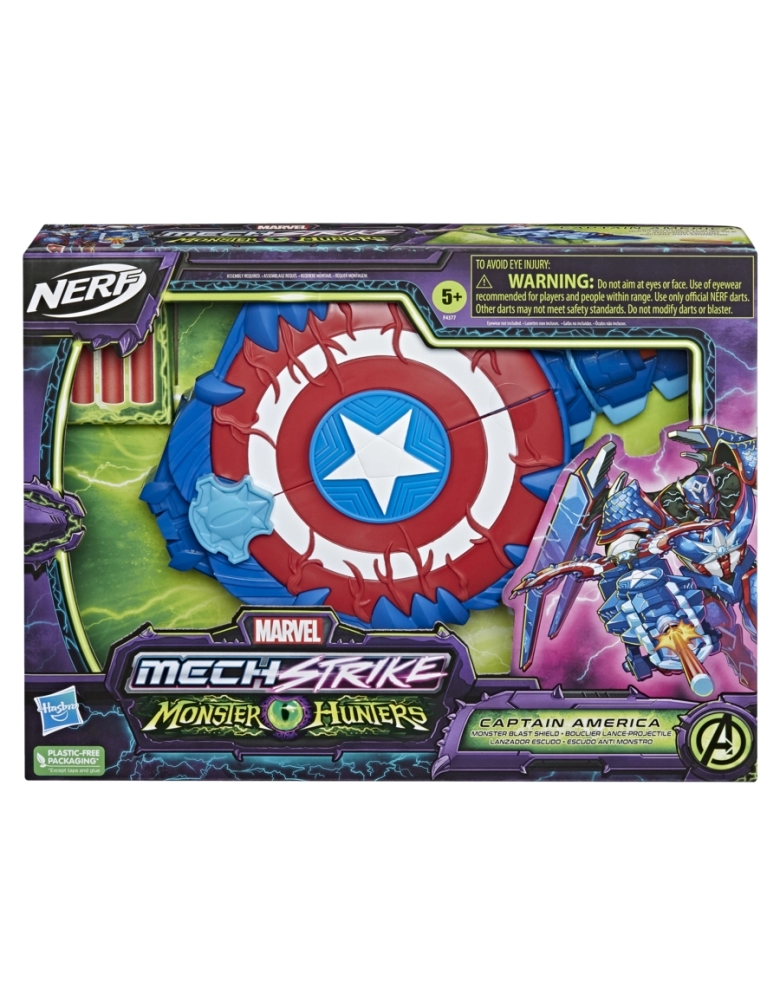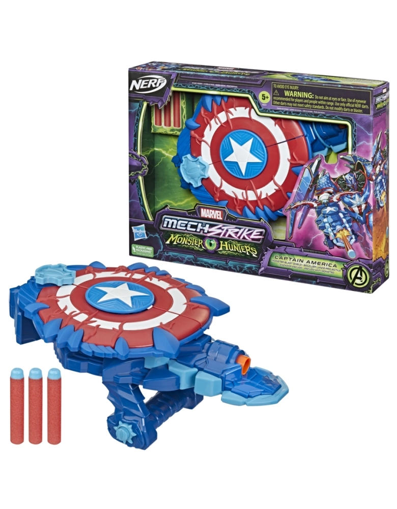 O herói Capitão América se prepara para a batalha em sua armadura mecanizada empunhando a Espada Caça-Monstros Crianças a partir dos 5 anos podem imaginar se preparando para aventuras monstruosas ao lado do primeiro Vingador com a Espada Caça-Monstros do Capitão América, inspirada no Universo Marvel! Apresentando design e decoração inspirados no universo Marvel, as crianças podem puxar o símbolo do olho do monstro para ativar a lâmina-surpresa. Basta mirar no alvo e pressionar o botão na alça para disparar um dardo NERF! Meninos e meninas vão adorar imaginar que estão se preparando para lutar contra vilões monstruosos que querem conquistar o mundo!