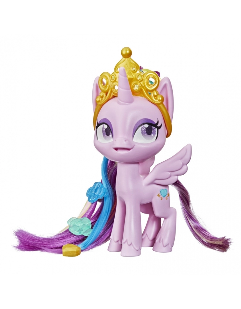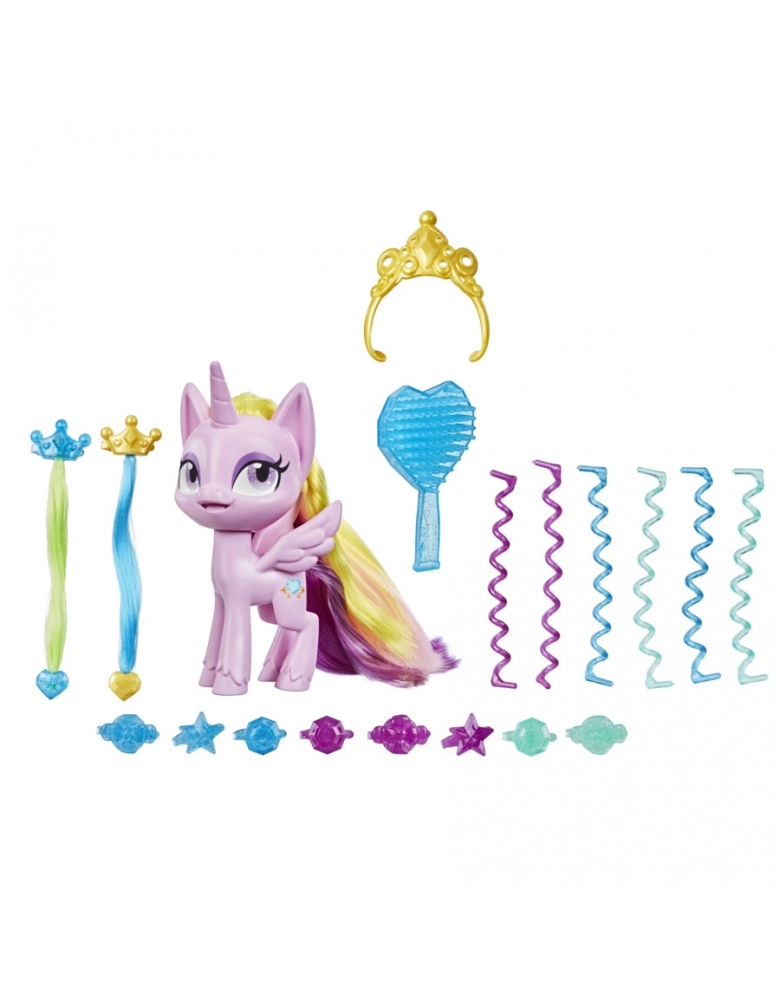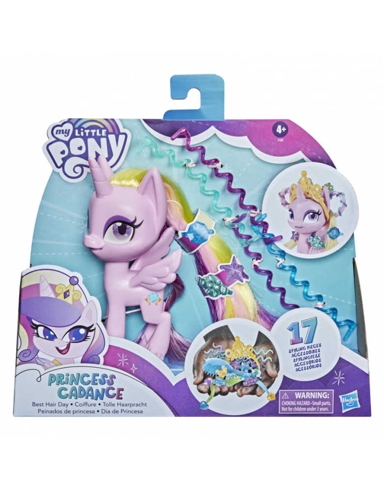 A princesa Cadance está tendo o seu dia de princesa. As crianças podem usar os acessórios inclusos para fazer vários penteados. Com tantos acessórios de cabelo, as crianças podem criar visuais incríveis. Pentear os cabelos, colocar extensões e usar presilhas ou tiara. O kit vem com presilhas, extensões de cabelo, escova e coroa. As presilhas e as extensões também podem ser usadas pelas crianças. As crianças podem criar um penteado fabuloso com o dispositivo incluído. Basta conectar uma ponta dos cabelos da figura, girar e criar o penteado. A figura possui cabelos mais longos do que as figuras normais de 12,5 cm.