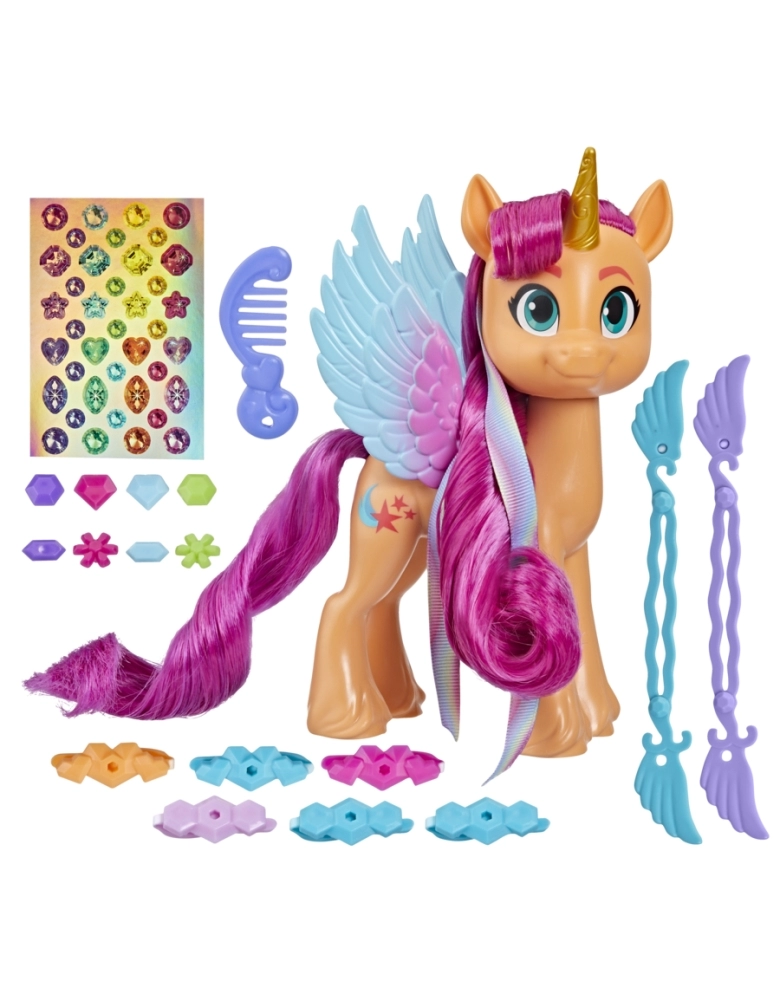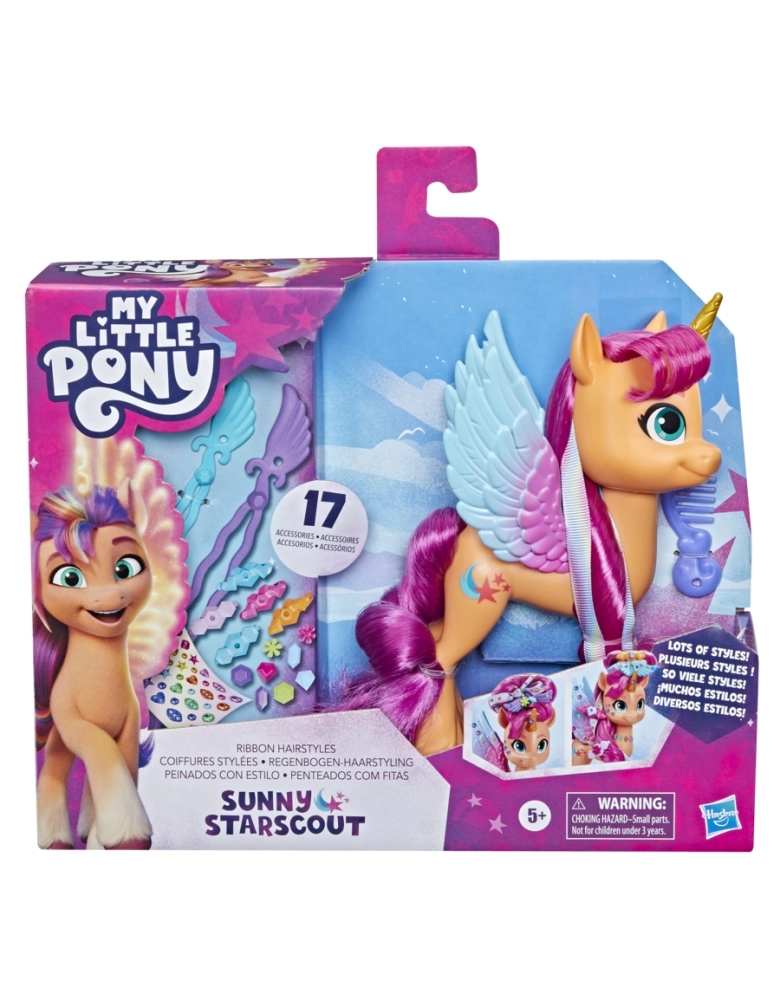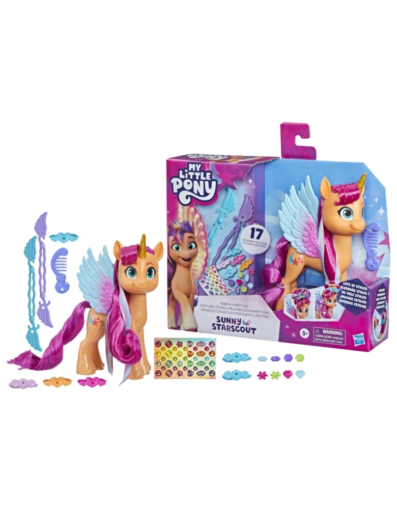 Apresentando Sunny Starscout, uma alicórnio aventureira de Maretime Bay. Ela é curiosa, aventureira e determinada a tornar o mundo um lugar melhor. No filme My Little Pony: A New Generation e na série My Little Pony: Make Your Mark, ela se torna um Alicórnio com penteados de arco-íris. O brinquedo Penteados com Fitas Sunny Starscout inclui 1 figura de pônei laranja de 15 cm com Cutie Mark de estrela cadente na lateral. A figura tem cabelo rosa longo e macio para criar penteados diferentes! As ferramentas e fitas para fazer coques de cabelo incluídas podem ser usadas para criar muitos looks e penteados estilosos. Vem com 17 acessórios para estilizar o cabelo de Sunny com pingentes, presilhas e ferramentas de modelagem. Novos e antigos fãs de My Little Pony a partir dos 5 anos podem imaginar aventuras com brinquedos inspirados no filme My Little Pony: A New Generation.