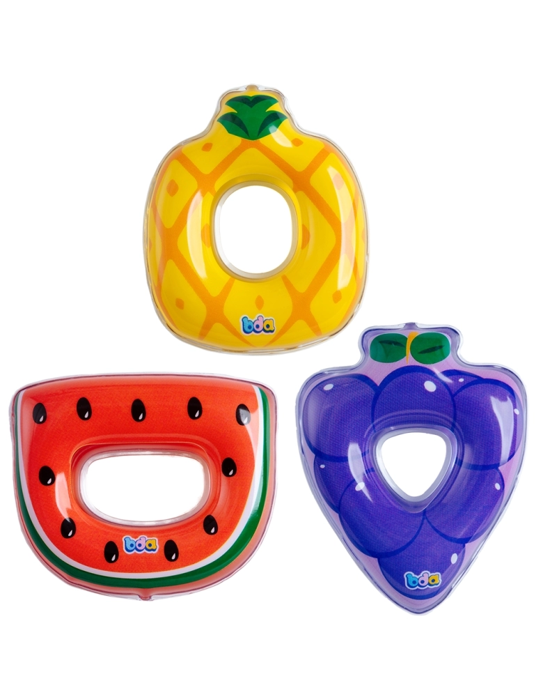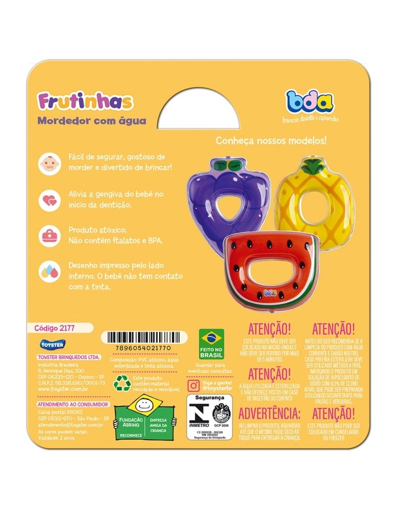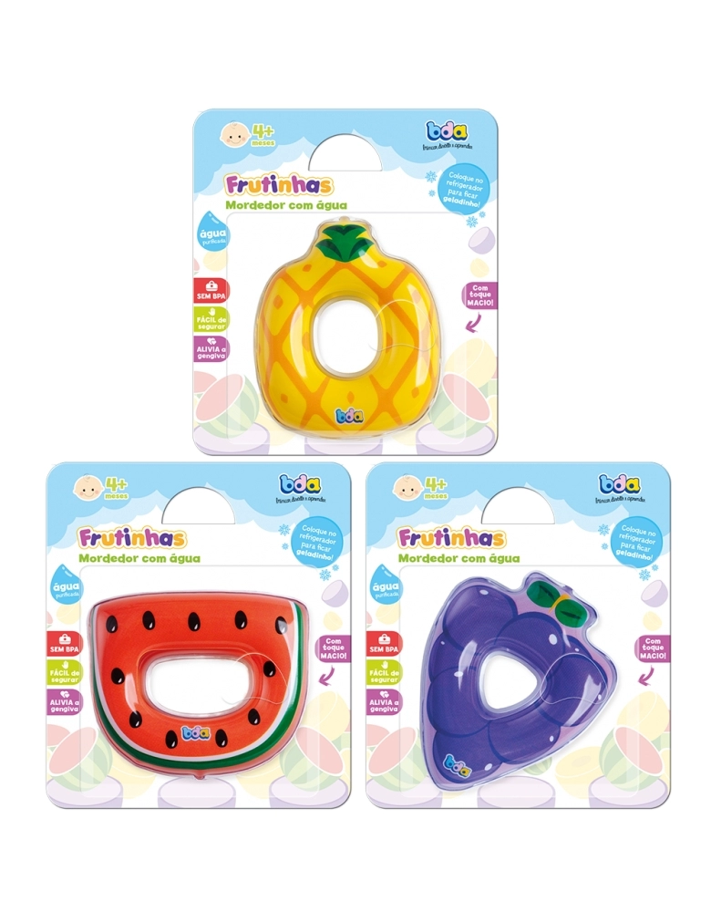 Mordedores com água no formato de frutinhas. Eles são seguros para o bebê e não contém ftalatos.