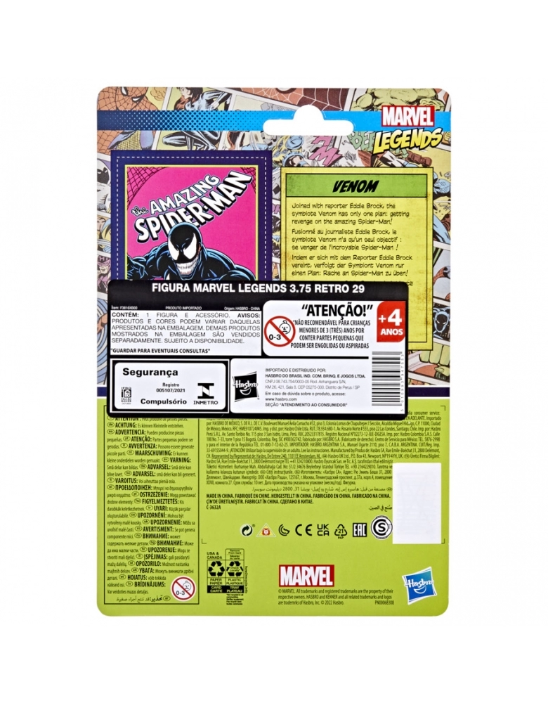 Após apoderar-se do corpo do repórter Eddie Brock, o simbionte Venom possui apenas um objetivo: vingar-se do espetacular Homem-Aranha! Com mais de 80 anos de história em quadrinhos, TV e cinema, a Marvel tornou-se referência para fãs e colecionadores em todo o mundo. Com a série Marvel Legends, os personagens favoritos dos fãs do universo dos quadrinhos Marvel e do universo cinematográfico Marvel são criados com detalhes e articulações de alta qualidade para serem exibidos como incríveis peças. De figuras a veículos a itens de cosplay, a série Marvel Legends oferece produtos inspirados em personagens para fãs Marvel.