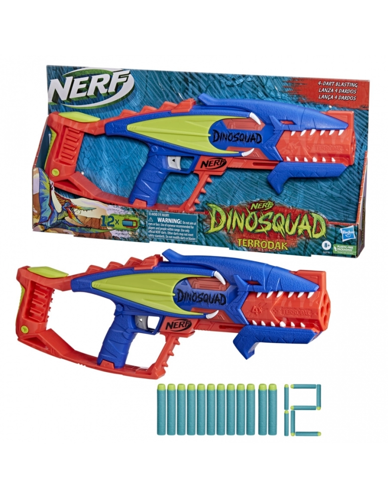 Membro de elite lendários DinoSquad! Muitas aventuras com a grande força dos dinossauros com este lançador Nerf com design inspirado em pterodáctilo para brincadeiras ao ar livre. O lançador Nerf DinoSquad Terrodak lança 4 dardos seguidos. Muita diversão com o lançador com tema de dinossauro. Inclui 12 dardos de espuma Nerf Elite. Basta carregar 4 dardos e reservar os 8 restantes para uma recarga rápida. Excelente brinquedo para meninos e meninas brincarem ao ar livre. O porta-dados ajuda na rápida recarga do brinquedo. Muitas aventuras com o lançador com tema de dinossauro. Fácil de usar. Basta inserir os 4 dardos no tubo frontal, mover o carregador para traz e para frente para preparar o lançador e apertar a alavanca de disparo para lançar 1 dardo. Recomenda-se o uso de óculos (não incluídos). Não requer pilhas. N erf and all related properties are trademar