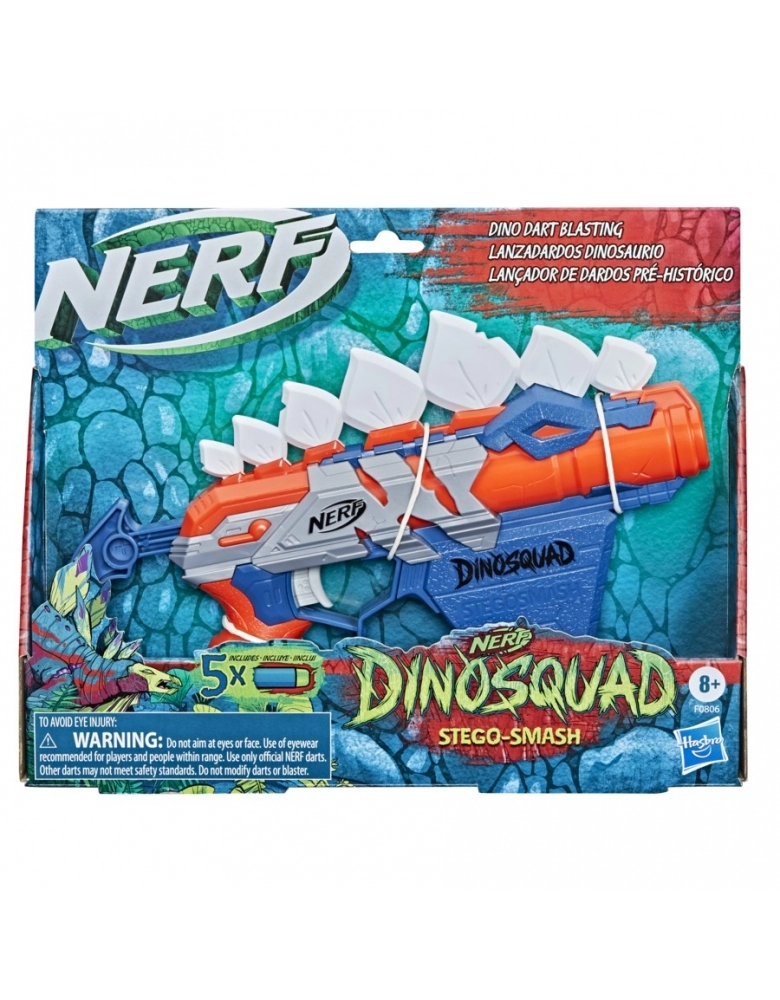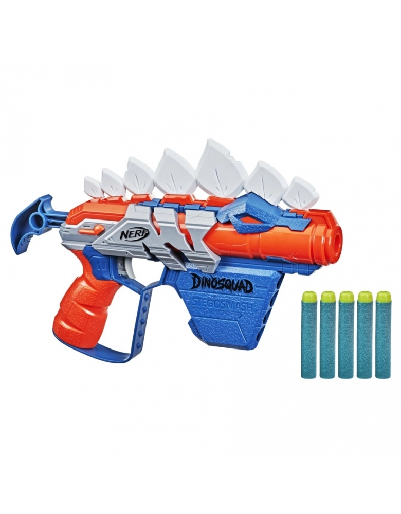 A aventura ganha novas emoções com estes lançadores do time de elite DinoSquad! Os mais poderosos dinossauros inspiram o design destes lançadores, trazendo grande ação à aventura!; Ação jurássica com este lançador de dardos Nerf DinoSquad Stego-smash! Possui um design impressionante de dinossauro, com a aparência de um estegossauro. O lançador possui carga frontal - basta inserir 1 dardo no tubo frontal, preparar e lançar. O lançador possui porta-dardos para 4 dardos no apoio, para manter dardos ao alcance para recarregar e continuar brincando. Inclui 5 dardos oficiais de espuma Nerf Elite que são testados e aprovados para desempenho e qualidade. Óculos recomendados (não incluídos). Não requer pilhas.;