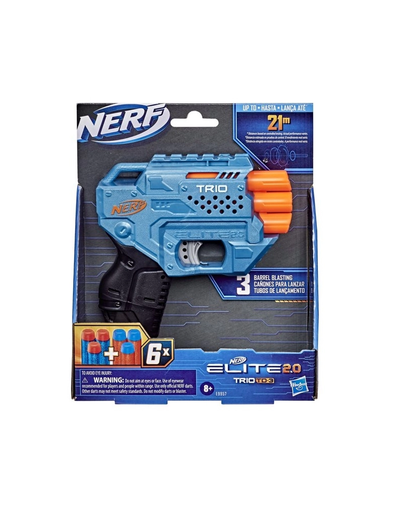 A aventura sobe de nível com os lançadores Nerf Elite 2.0, que apresentam recursos de personalização integrados para que se possa utilizar acessórios e sair na frente na aventura Nerf. É hora de montar seu próprio lançador Elite 2.0 para otimizar sua estratégia de jogo e trazer desempenho tático e flexibilidade a todas as aventuras! Lançar 3 dardos seguidos com o lançador Nerf Elite 2.0 Trio TD-3, que possui um trilho tático para que se possa personalizar o lançador com diferentes acessórios Nerf. O lançador comporta 3 dardos sobrepostos de forma vertical. Basta carregar 1 dardo em cada câmara, puxar o carregador e apertar alavanca de disparo para lançar um dardo. Inclui 6 dardos oficiais da Nerf Elite, oferecendo 3 dardos para o lançador e 3 dardos para recarga. Óculos recomendados. Acessórios e óculos adicionais não incluídos. Não requer pilhas.