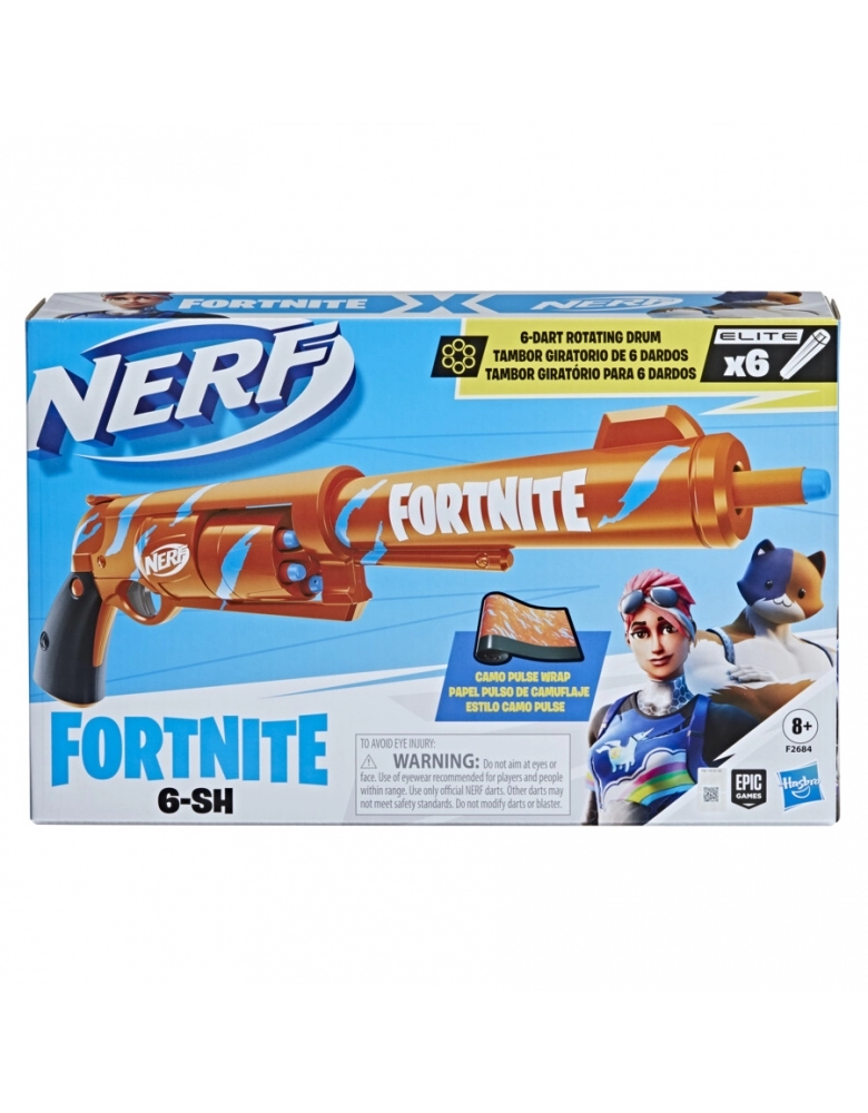 O lançador Fortnite 6-SH é inspirado no lançador usado em Fortnite, com design inspirado neste famoso videogame e vem com o envelopamento Camo Pulse. Basta puxar para baixo o dispositivo de disparo para preparar o lançador antes de apertar a alavanca de disparo para lançar o dardo. Inclui um tambor giratório para 6 dardos e vem com 6 dardos oficiais Nerf Elite, testados e aprovados para performance e qualidade. Não requer pilhas. Recomenda-se o uso de óculos (não inclusos).