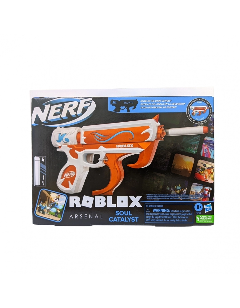 Este blaster Nerf Roblox Arsenal: Soul Catalyst tem inspiração na experiência Roblox Arsenal by ROLVe Community! Este lançador inclui um código especial que permite resgatar um item virtual exclusivo no Roblox.* O lançador Soul Catalyst apresenta facilidade na hora de atirar para lançar dardos em emocionantes jogos ao ar livre. Basta puxar o slide para trás e soltá-lo, permitindo que o slide volte sozinho. Puxe o gatilho e deixe o dardo voar em jogos ao ar livre! Detalhes legais de brilho no escuro** no lançador adicionam um visual incrível aos seus jogos Nerf. O blaster tem capacidade de dardo único e fácil carregamento frontal. Ele vem com 4 dardos de espuma Nerf oficiais. Lance-se em batalhas Nerf com o Nerf Roblox Arsenal: Soul Catalyst para jogar ao ar livre! Óculos recomendados (não incluídos). Copyright 2023 Roblox Corp. ROBLOX é uma marca registrada. Todos os direitos reservados. Hasbro e todos os termos relacionados são marcas comerciais da Hasbro.