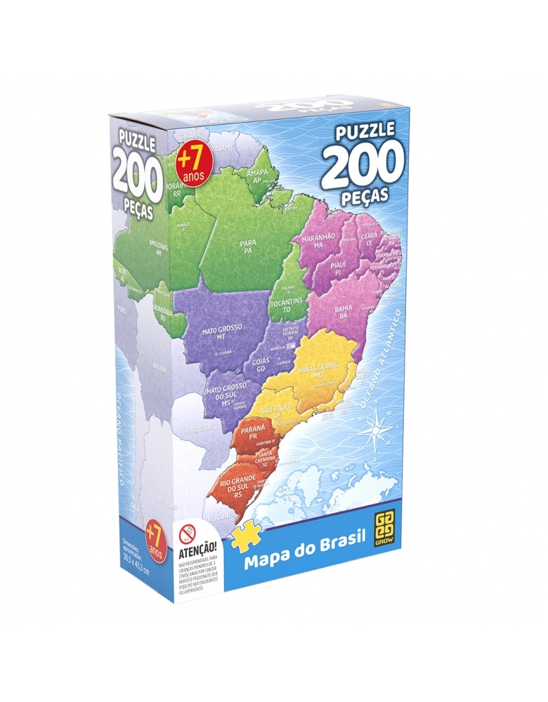 O puzzle Mapa do Brasil, de 200 peças, é um quebra-cabeça educativo com a divisão dos estados, as capitais e bandeiras estaduais para a criança se divertir enquanto memoriza o mapa do Brasil.