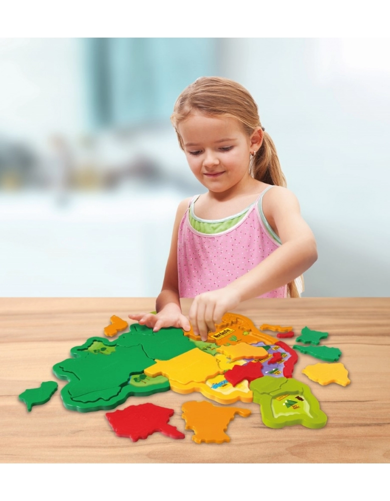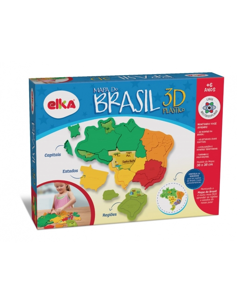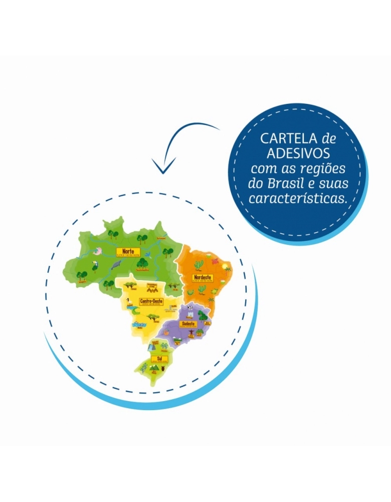 Conhecer o Brasil nunca foi tão divertido! Montando o Mapa do Brasil 3D é muito mais fácil aprender as regiões e estados do nosso país! A maneira mais divertida, estimulante e dinâmica de aprender brincando! cartela de adesivos com as regiões do Brasil e suas características. Aprende brincando