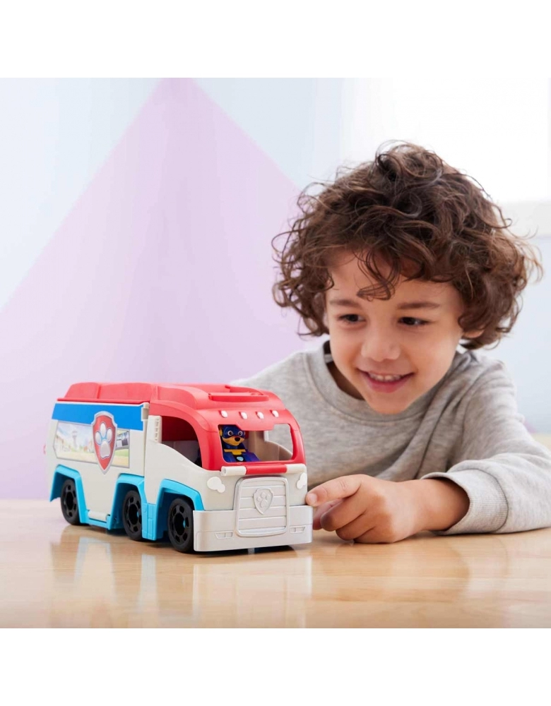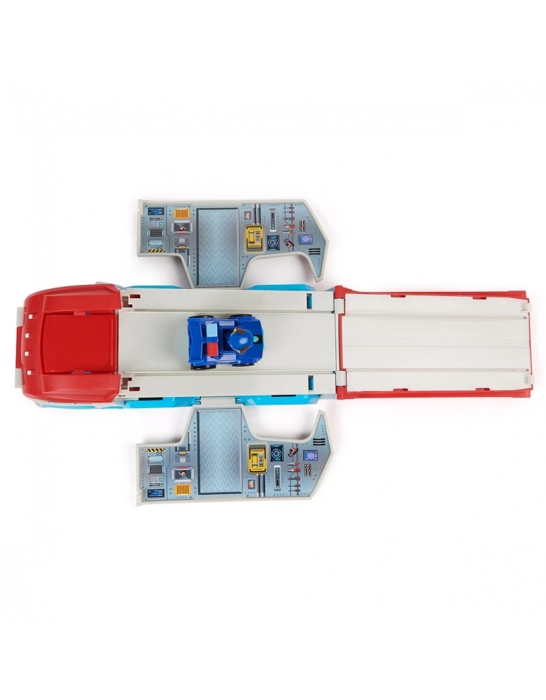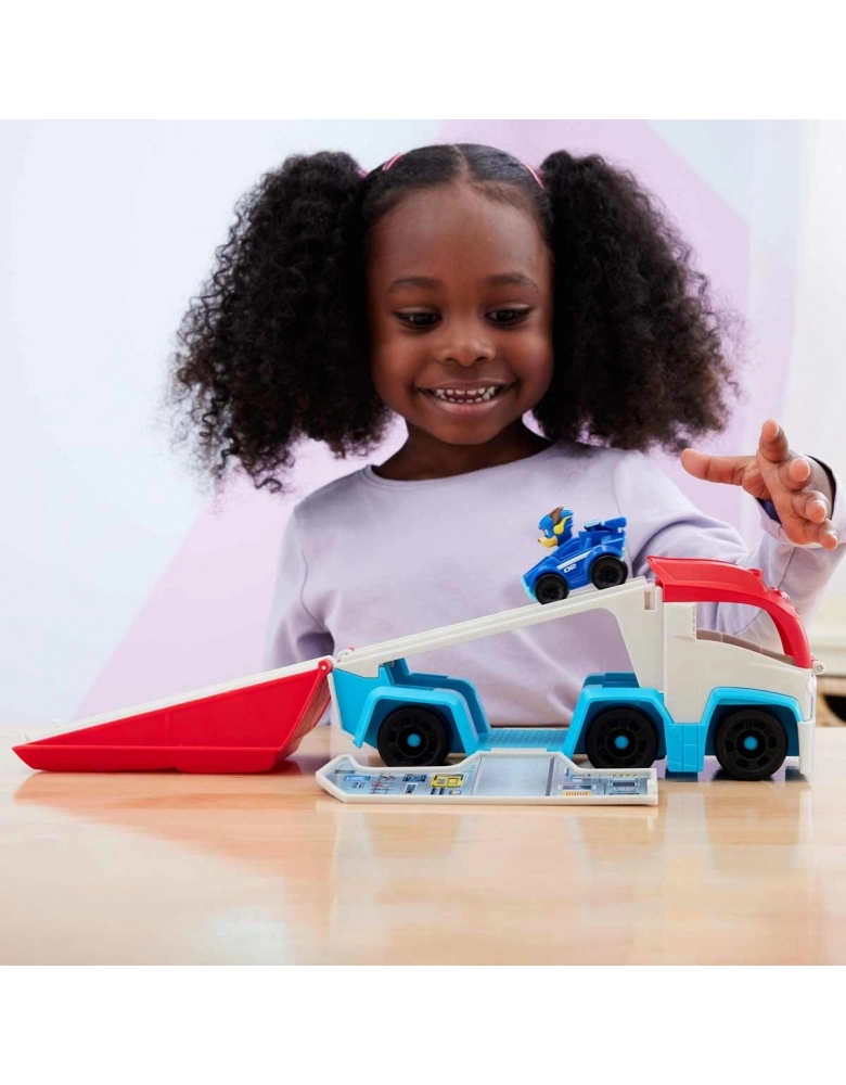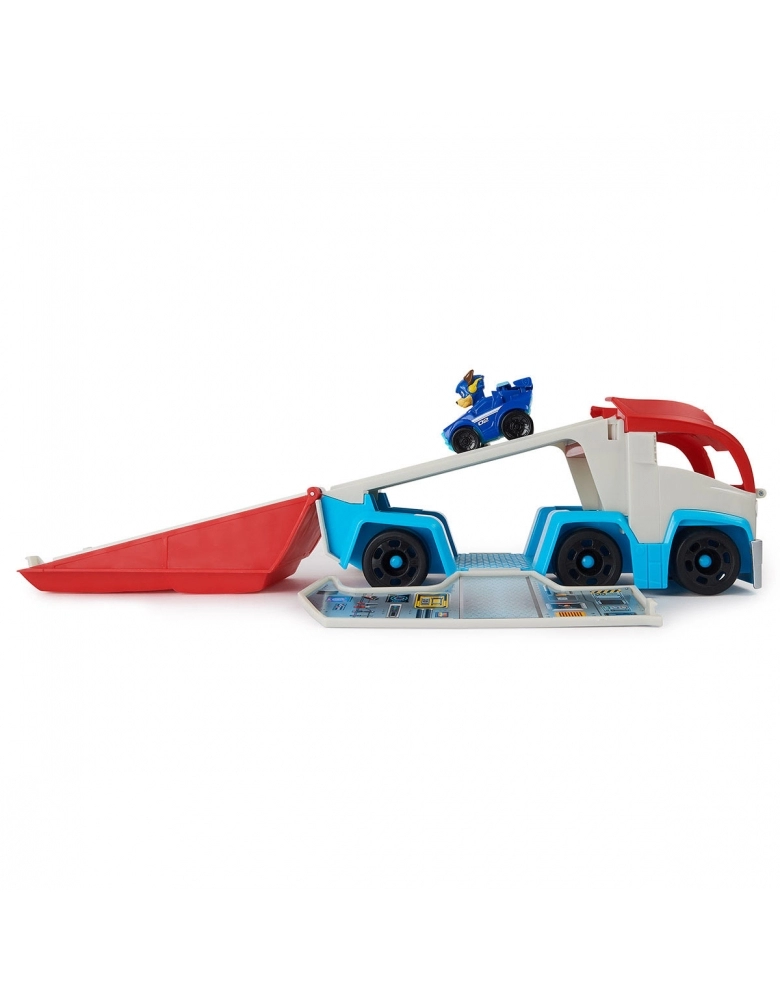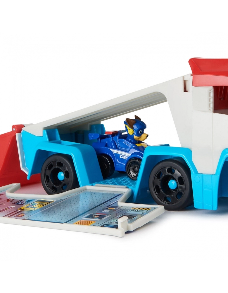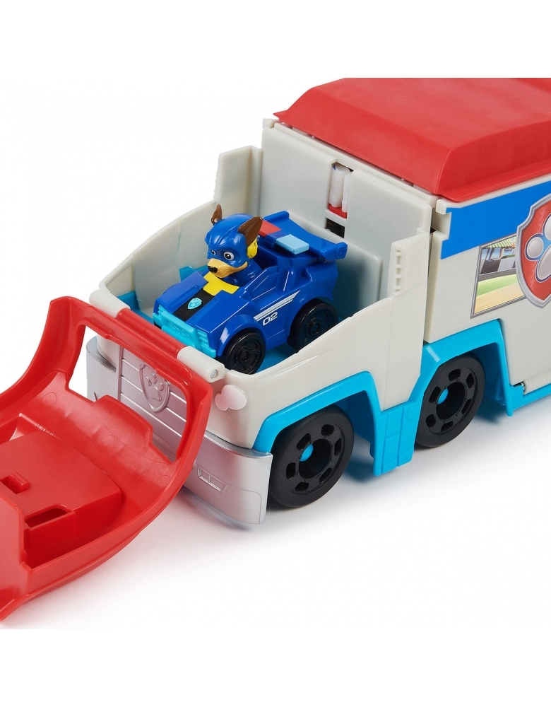 O PATRULHADOR VIRA UM CENTRO DE CONTROLE. O conjunto de veículos apresenta uma transformação emocionante de um caminhão de brinquedo Patrulha Canina em um incrível centro de comando móvel, completo com rampa de lançamento de veículos e espaço de armazenamento de brinquedos, para os carros de corrida do resto da Patrulha (cada um vendido separadamente)!