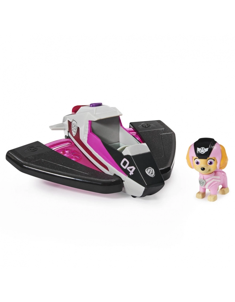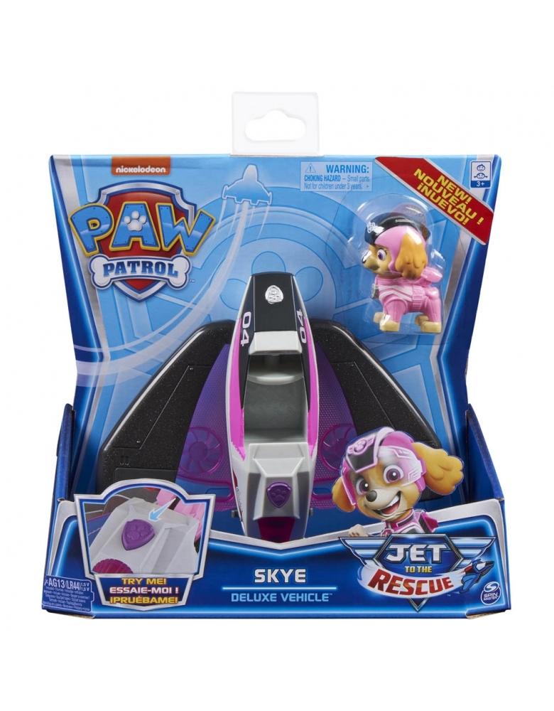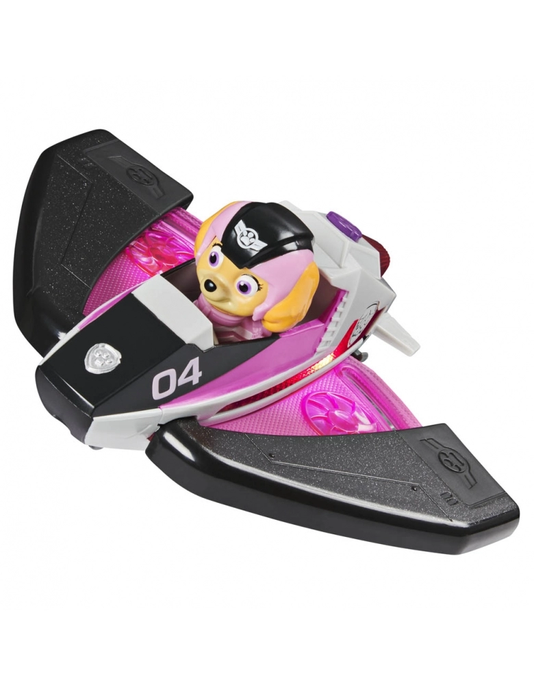 este Veículo Deluxe Apresenta Detalhes Realistas, Luzes e Sons. a Skye Vem com Um Traje de Vôo Rosa e Capacete. Quando Chagar a Hora de Um Resgate, Coloque Skye Atrás do Volante de Seu Veículo de Luxo e Aperte o Botão Na Parte Superior Para Fazê-Lo Se Transformar. Conforme o Jato de Skye Muda do Modo Furtivo Para o Modo de Resgate, Partes Das Asas Aparecem, Ativando As Luzes e Sons Emocionantes! Para Ouvir Mais Sons, Pressione o Botão a Qualquer Momento