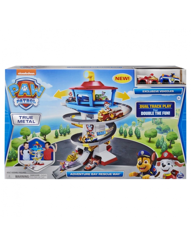 Este conjunto de pistas da Lookout Tower tem dois caminhos de pista e pode lançar até seis veículos PAW Patrol True Metal de uma vez. Além disso, vem com versões do Chase e os veículos diecast do Marshall apresentando detalhes e gráficos autênticos, rodas reais e material diecast de metal, os veículos True Metal se parecem com os veículos da Patrulha Canina do programa de TV.