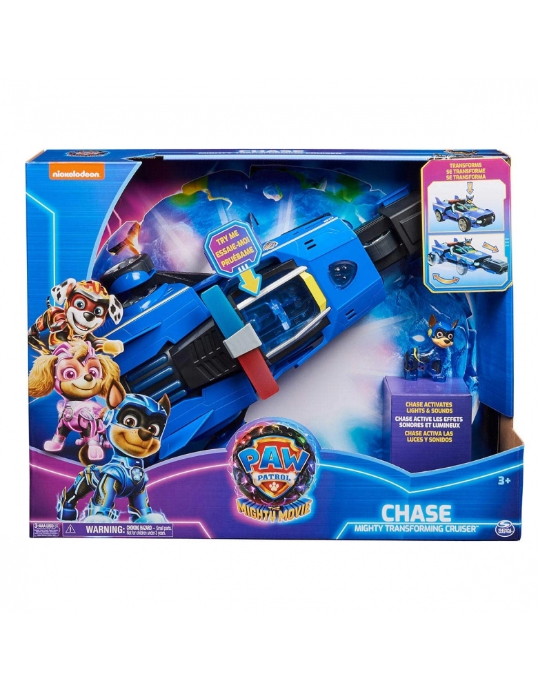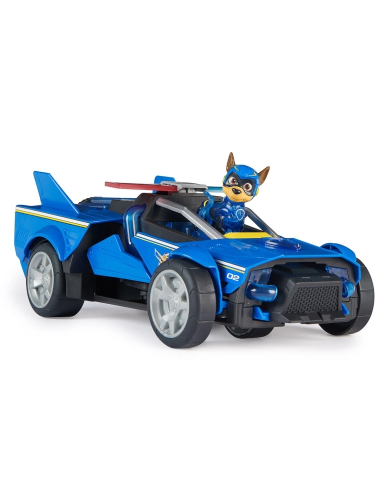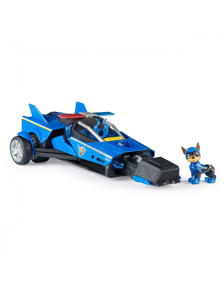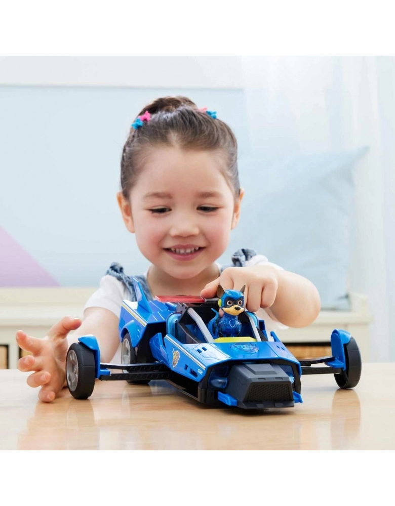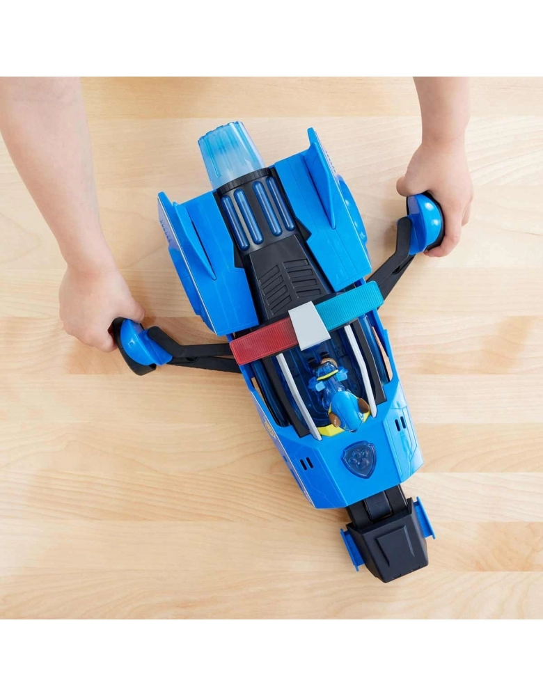 TRAJE EXCLUSIVO. Se divirta com o Chase vestido com seu uniforme azul da Patulha Canina: The Mighty Movie, com seções translúcidas e um capacete incrível