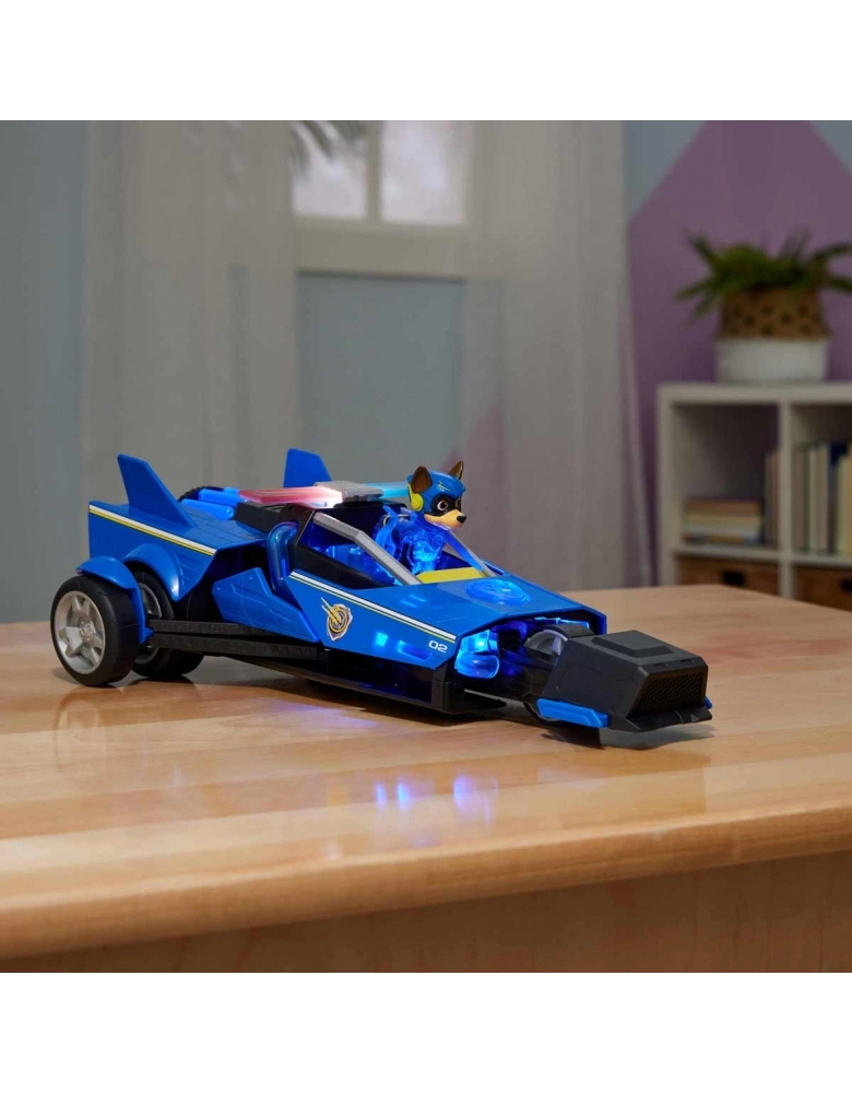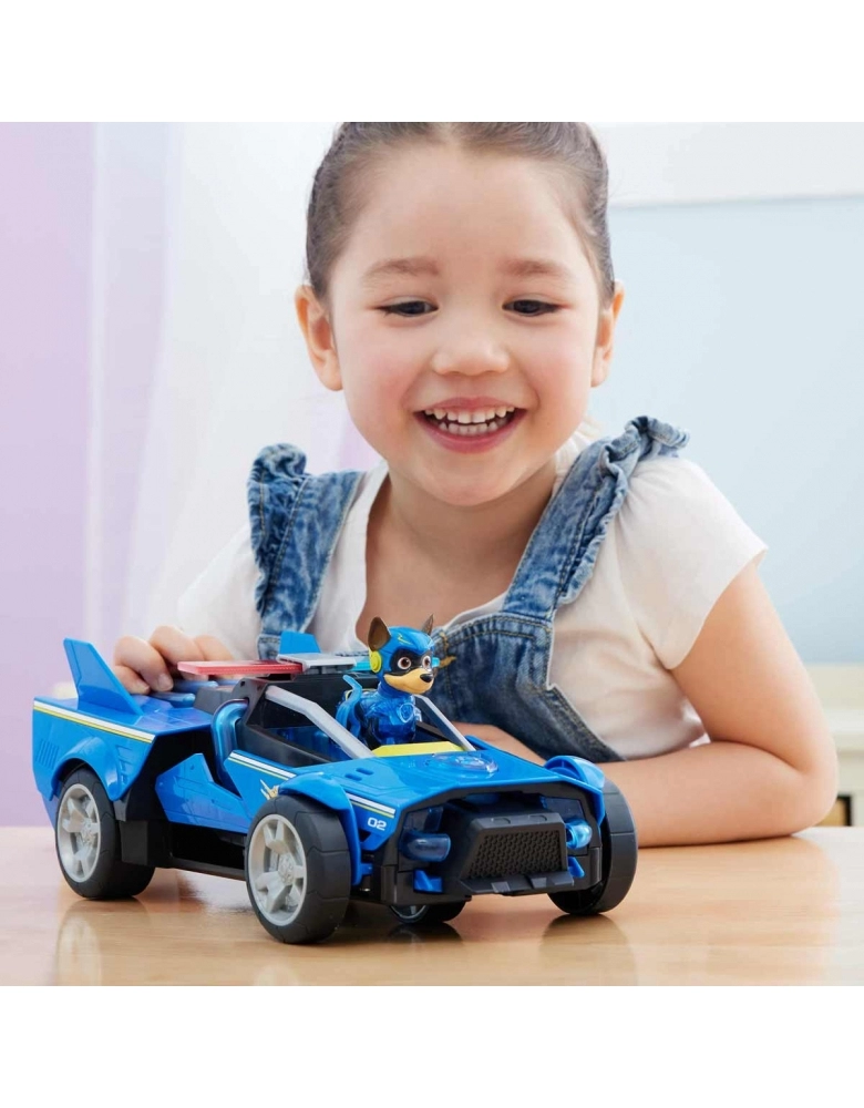 ROUPA E VEÍCULO QUE BRILHAM. Coloque sua figura de ação Chase no assento de seu brinquedo de carro de polícia e observe suas patas e veículos se iluminarem!