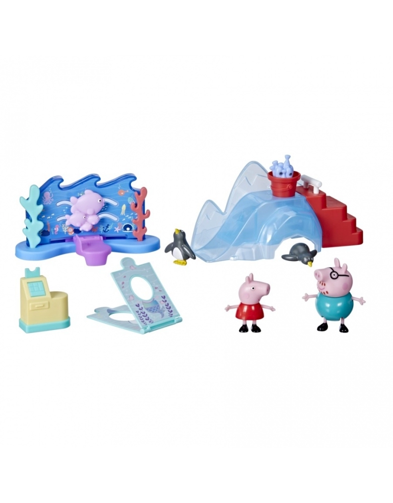 Com o kit Peppa Aventura no Aquário, as crianças vão imaginar uma visita ao aquário com Peppa e Papai Pig. O cenário traz um cardume de peixes coloridos. Basta colocar Peppa no local determinado e pressionar para ver os peixes se movendo. Será que eles vão seguir o Papai Pig também? As crianças podem levar as figuras a subirem os degraus e, em seguida, pressionar a barra de segurança para encher o balde de peixes. As 2 figuras de pinguim vão gostar do almoço. Peppa e o Papai Pig podem posar para as fotos. A caixa registradora se abre ao apertar o botão.