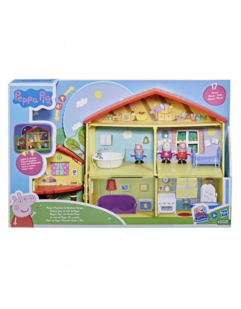 As crianças vão adorar brincar com a Casa da Peppa diversão noite e dia, que vem com 5 cômodos para muita imaginação. Basta girar o discador para alternar o modo do brinquedo entre dia e noite. O brinquedo emite sons e luzes de acordo com o modo selecionado. 2 pontos na casa reagem de acordo com o personagem posicionado acima deles. ; O brinquedo vem com 3 figuras - Peppa Pig, George Pig e Susie Ovelha - e 13 acessórios divertidos, como privada, TV e geladeira. E do lado fora? Uma linda casa na árvore. Com sons e frases da série, este brinquedo é ideal para fãs e crianças a partir dos 3 anos. O Carro vermelho da família Pig combinaria bem com esta linda casa (vendidos separadamente e sujeitos à disponibilidade).; Com tanto para explorar, aventura é o que não falta. Por isso que a Susie Ovelha veio fazer uma visita.;
