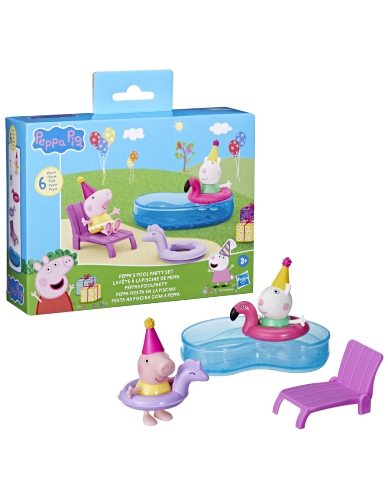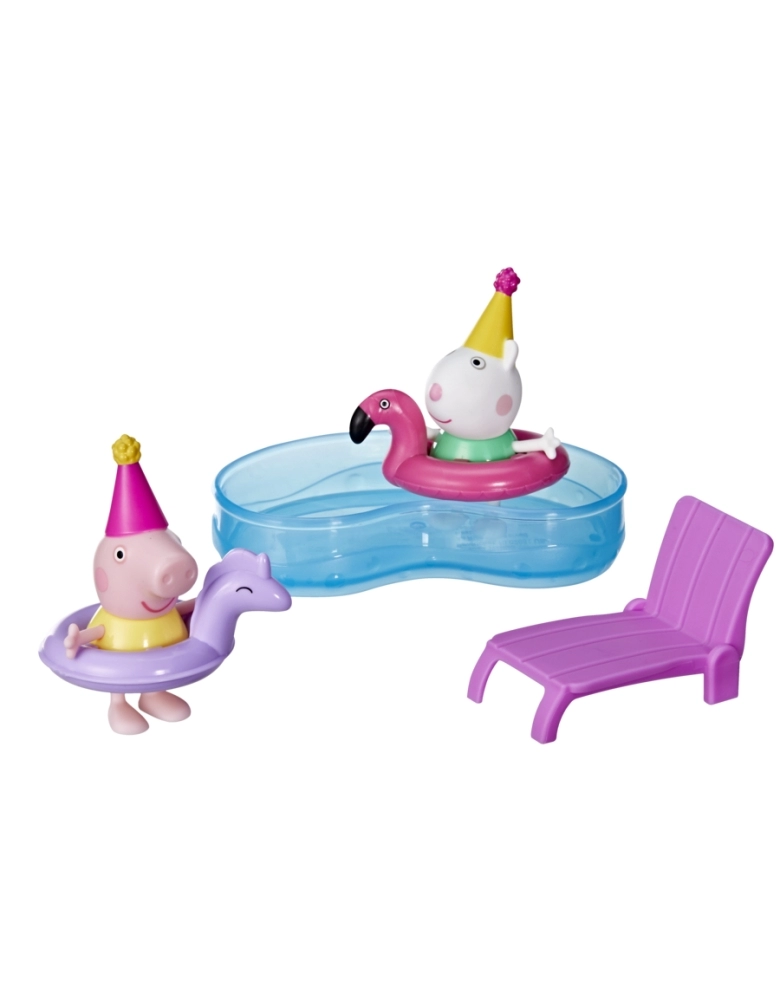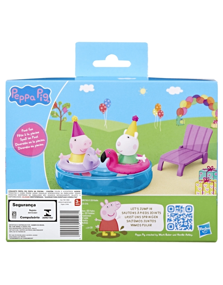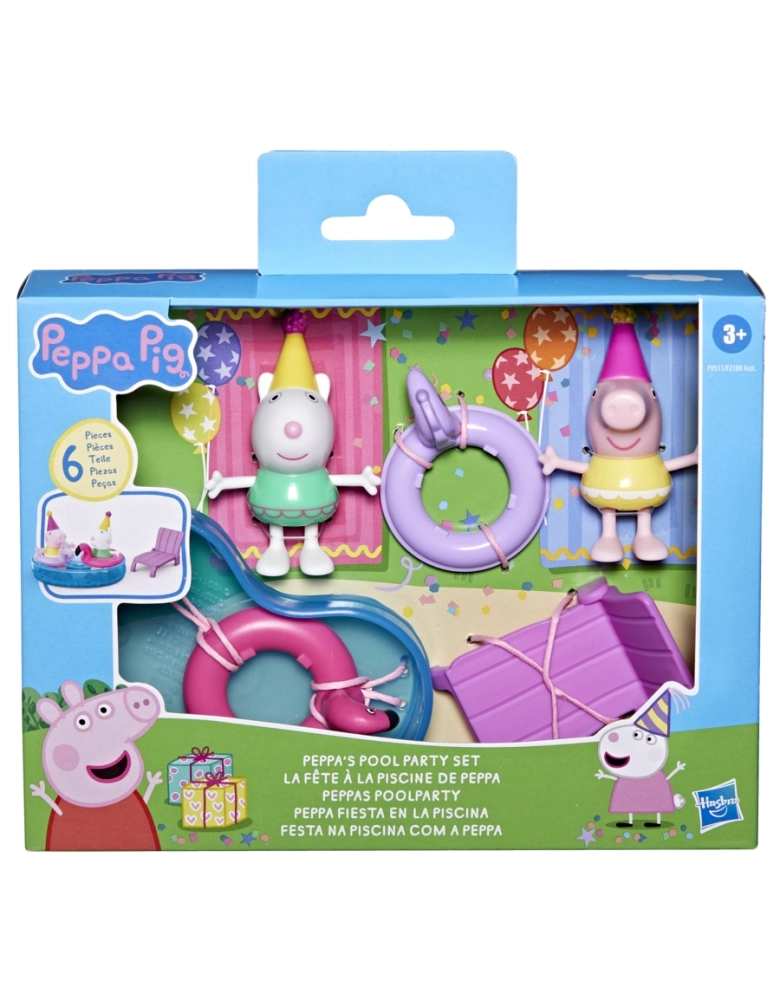 Muita diversão com o kit Festa na Piscina com a Peppa! Este conjunto de 6 peças da Peppa Pig vem com 2 personagens favoritos da Peppa Pig, Suzy Ovelha e a própria Peppa, vestindo roupas de banho e chapéus de festa! As crianças podem imaginar-se num dia na piscina com a Peppa e Suzy brincando nas boias de flamimgo e unicórnio. Ótimo brinquedo para meninos e meninas a partir dos 3 anos. Os brinquedos Peppa Pig para meninos e meninas a partir dos 3 anos são excelentes presentes para crianças que gostam da série animada. © 2023 ABD Ltd/Hasbro/HCPL Ltd. Hasbro and all related terms are trademarks of Hasbro.