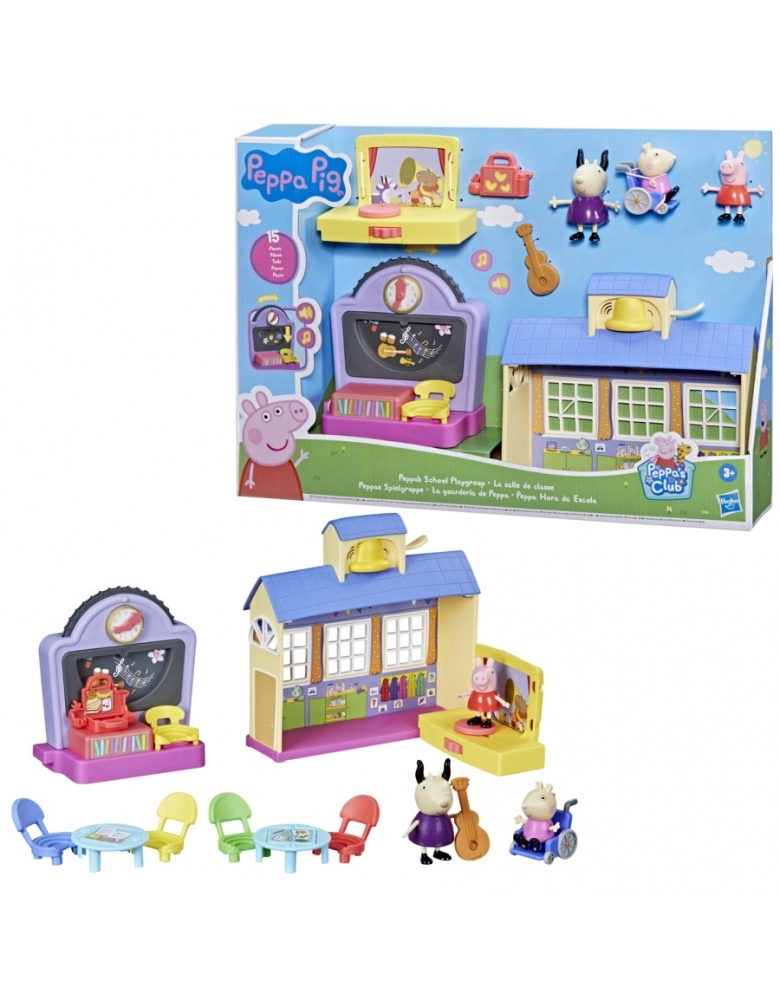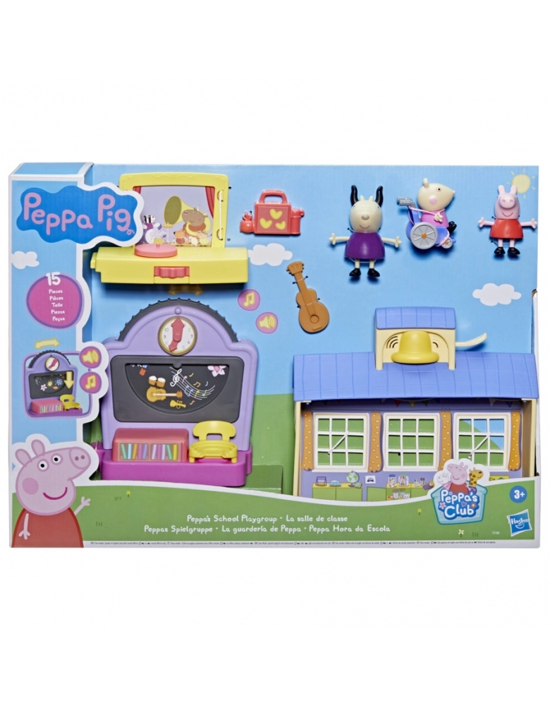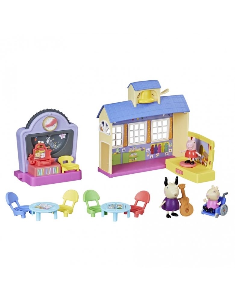 Agora crianças a partir dos 3 anos e fãs da Peppa Pig bodem brincar de ir para escola com a Peppa e seus amigos! Inspirado na série de animação. Hora da aula! As crianças podem tocar o sino ao empurrar uma alavanca, mover os ponteiros do relógio e girar o discador para mudar as lições que aparecem na lousa para ouvir frases relacionadas a cada lição. O palco tem fundo reversível. As crianças podem posicionar figuras de 7,5 cm nele e girar o discador para movê-las. Este kit contém 2 figuras e 9 acessórios e é um excelente presente para todas as ocasiões para crianças e fãs da Peppa Pig a partir dos 3 anos.