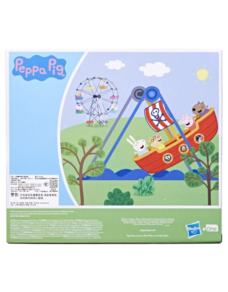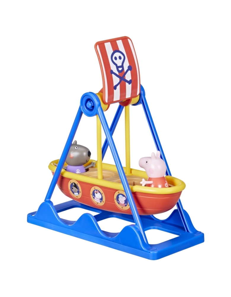 Um dia no parque de diversão com o Navio Pirata da Peppa! Este brinquedo adorável da Peppa Pig balança para frente e para trás. As crianças podem colocar as figuras no brinquedo e empurrá-lo para imagina Peppa Pig e Danny Cão a divertir-se bastante. As figuras de Peppa e Danny vestem roupas de pirata. É um excelente presente para crianças a partir dos 3 anos fãs da Peppa e de piratas. © 2022 ABD Ltd/Ent. One UK Ltd. Hasbro and all related terms are trademarks of Hasbro.