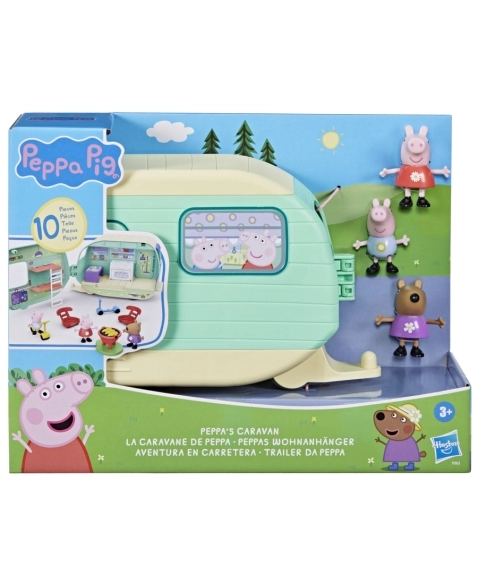 Muita diversão com o playset Trailer da Peppa! O trailer tem rodinhas para se mover. Pode ser encaixado ao Carro Vermelho da Família Pig (vendido separadamente, sujeito a disponibilidade). Abrir o toldo para brincar, imaginar a Peppa na cozinha e preparar as camas antes de dormir.