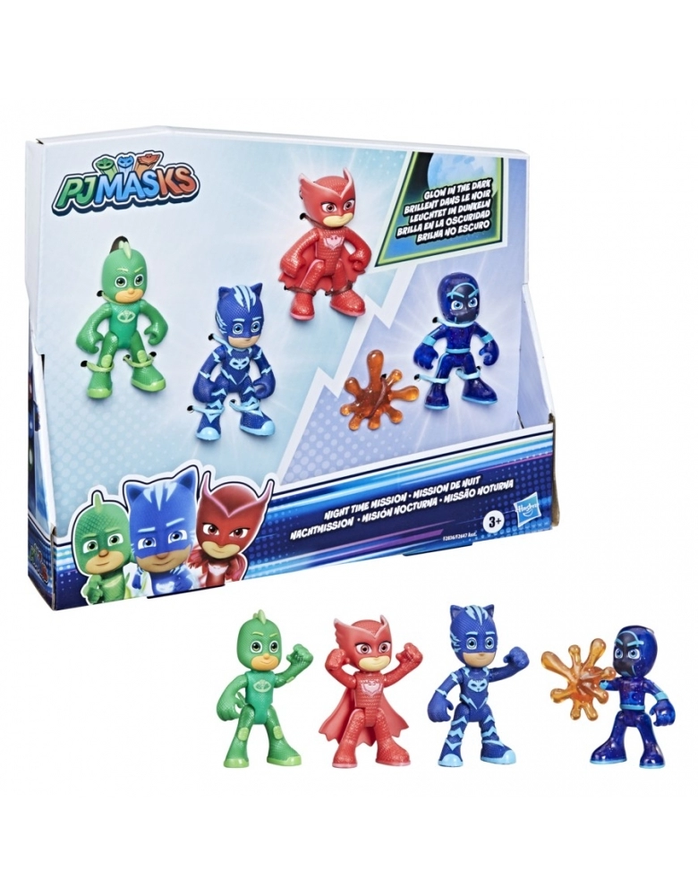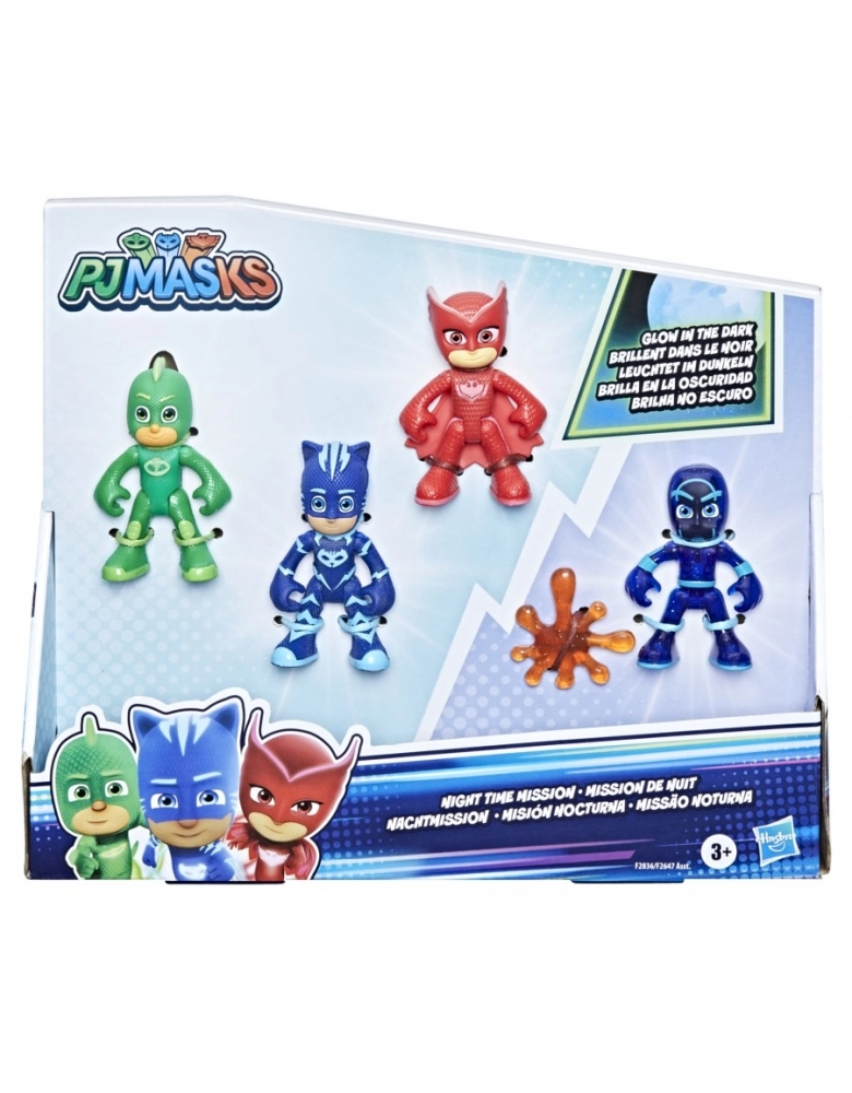 As figuras do kit PJ Masks Missão Noturna estão prontas para brilhar. As crianças podem partir para aventuras com estas figuras divertidas que brilham no escuro. As figuras articuladas do Menino gato, do Lagartixo e da Corujita brilham no escuro para que as crianças a partir dos 3 anos possam recriar as suas cenas favoritas da série. Muita ação dos heróis contra o vilão. Esta figura do Ninja noturno vem com um acessório. As figuras são compatíveis com os brinquedos PJ Masks que possuem Hero ID (vendidos separadamente e sujeitos à disponibilidade). Os kits Missão Noturna e Missão Aérea (vendidos separadamente e sujeitos à disponibilidade) são um ótimo presente para crianças a partir dos 3 anos.