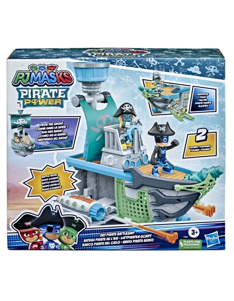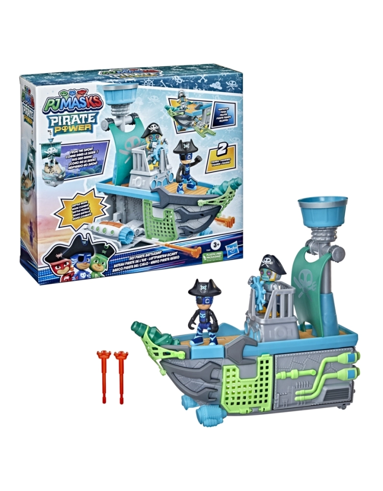 As crianças podem recriar as cenas favoritas da série com este kit com navio pirata aéreo e 2 figuras dos PJ Masks! As crianças vão adorar a diversão com as figuras dos heróis Menino Gato Pirata e Robô Pirata, além de brincar com o veículo no modo de navio pirata e no modo de batalha com incríveis lançadores de projéteis laterais. A figura Menino Gato Pirata vem com chapéu de pirata e detalhes incríveis. As figuras são compatíveis com os brinquedos PJ Masks que possuem Hero ID (vendidos separadamente e sujeitos à disponibilidade). Este kit vem em uma embalagem reciclável que não contém plástico, exceto pela fita adesiva e cola. Excelente presente de aniversário ou outras celebrações para meninos e meninas a partir dos 3 anos que adoram aventuras de super-heróis.